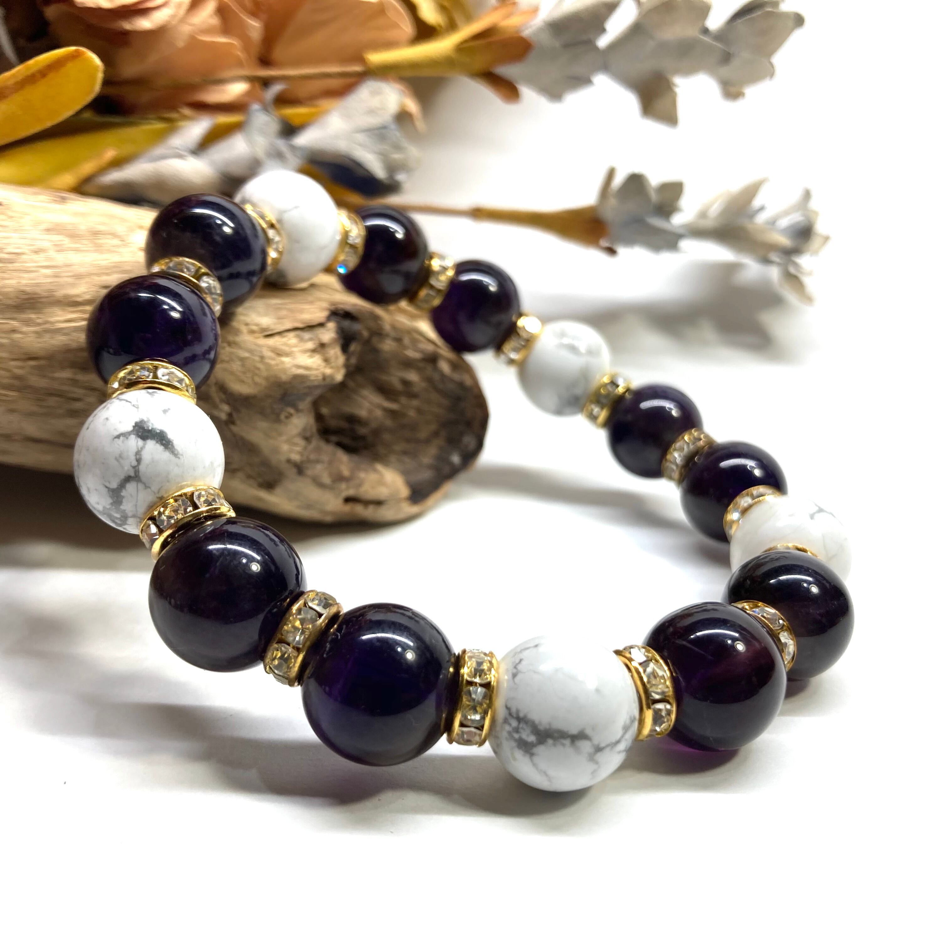 こちらは、12mm玉のアメジストとハウライトを組み合わせたパワーストーンブレスレットです。間にはロンデルを挟み高級感あるデザインに仕上げております。石大きさは12mm玉を使用して内周約18cmです。数に限りがございますので気になる方はお早めにどうぞ。