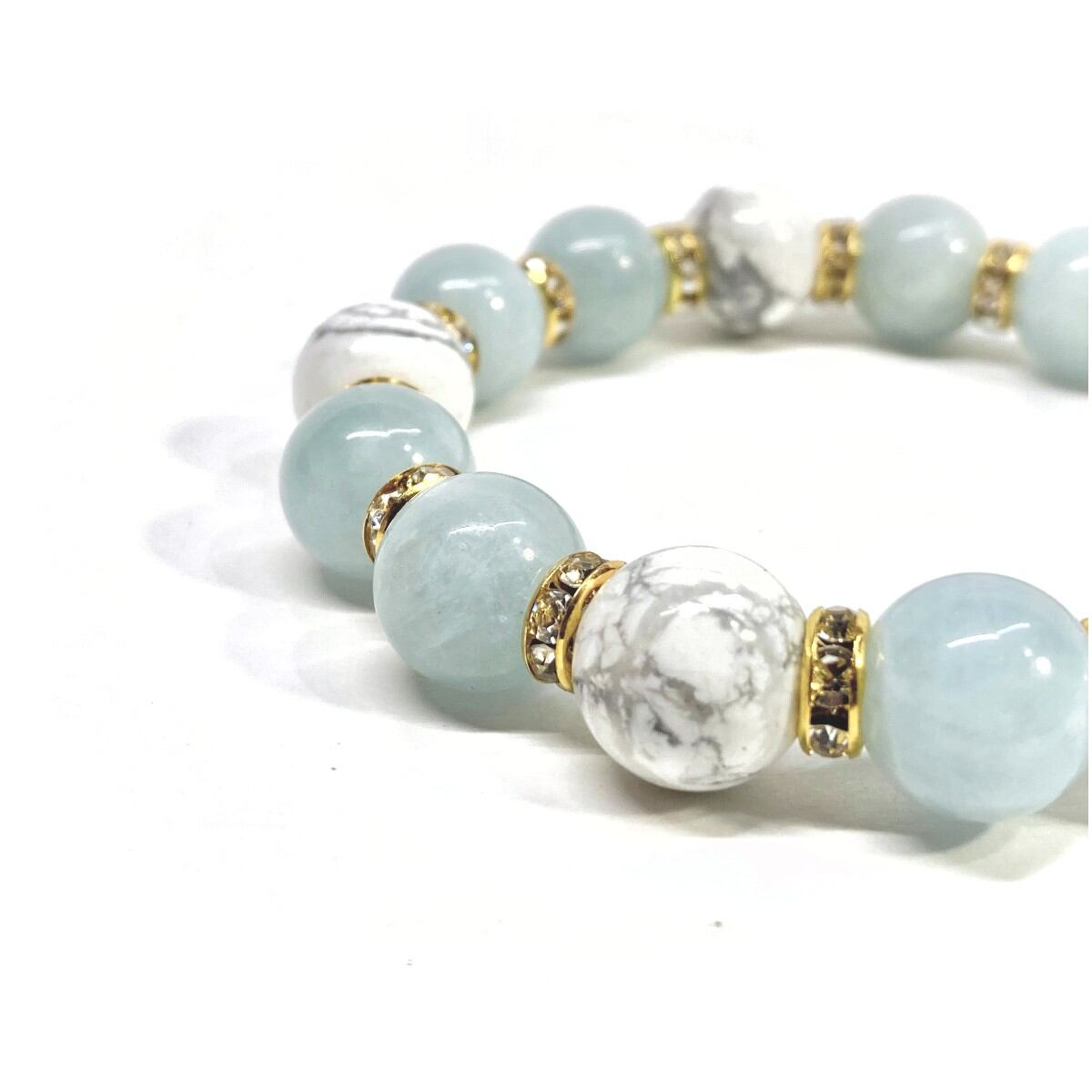こちらは、12mm玉のアクアマリンとハウライトを組み合わせたパワーストーンブレスレットです。間にはロンデルを挟み高級感あるデザインに仕上げております。石大きさは12mm玉を使用して内周約18cmです。気になる方は是非この機会にどうぞ。