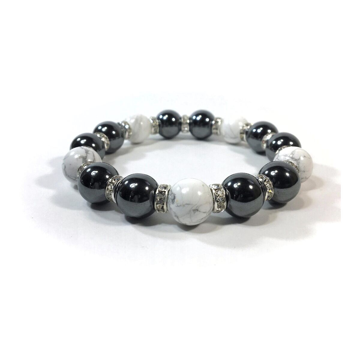 こちらは、ヘマタイトとハウライトを組み合わせたパワーストーンブレスレットです。間にはロンデルを挟み高級感あるデザインに仕上げております。石大きさは12mm玉を使用して内周約18cmです。気になる方は是非この機会にどうぞ。