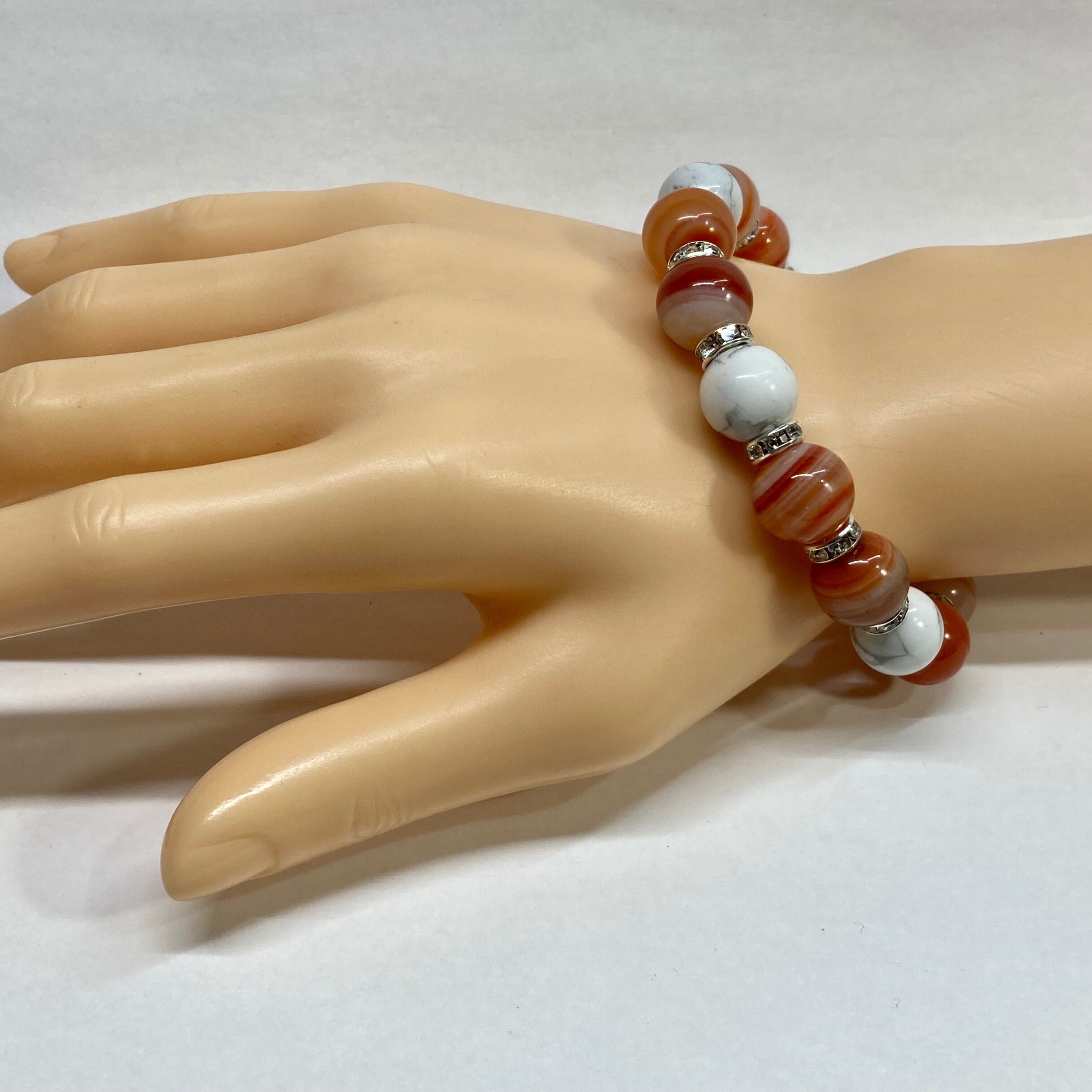 こちらは、12mm玉のカーネリアン・サードニクス(サードオニキス)とハウライトを組み合わせたパワーストーンブレスレットです。間にはロンデルを挟み高級感あるデザインに仕上げております。石大きさは12mm玉を使用して内周約18cmです。気になる方は是非この機会にどうぞ。