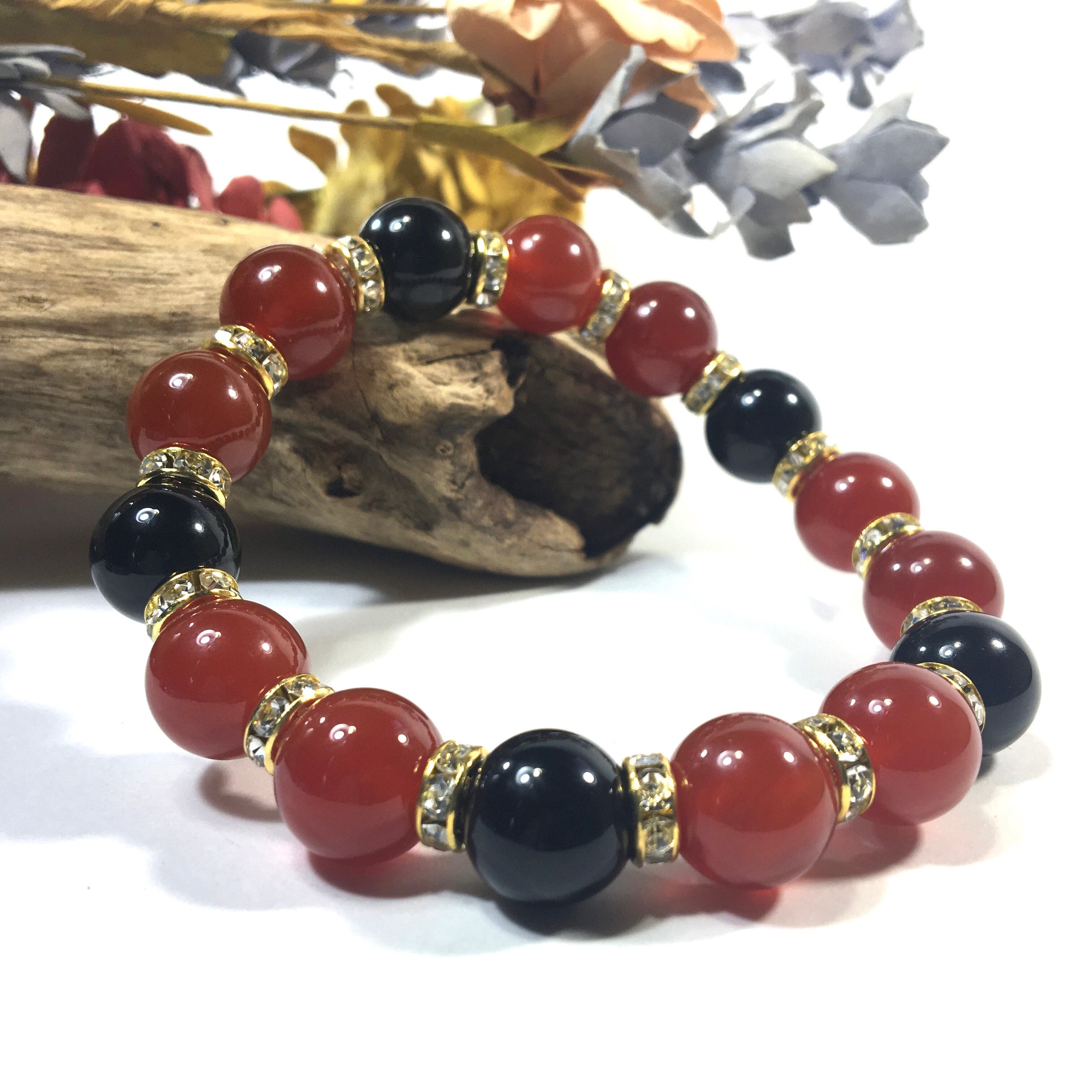 こちらは、赤瑪瑙とオニキスを組み合わせたパワーストーンブレスレットです。間にはロンデルを挟み高級感あるデザインに仕上げております。石大きさは12mm玉を使用して内周約18cmです。気になる方は是非この機会にどうぞ。