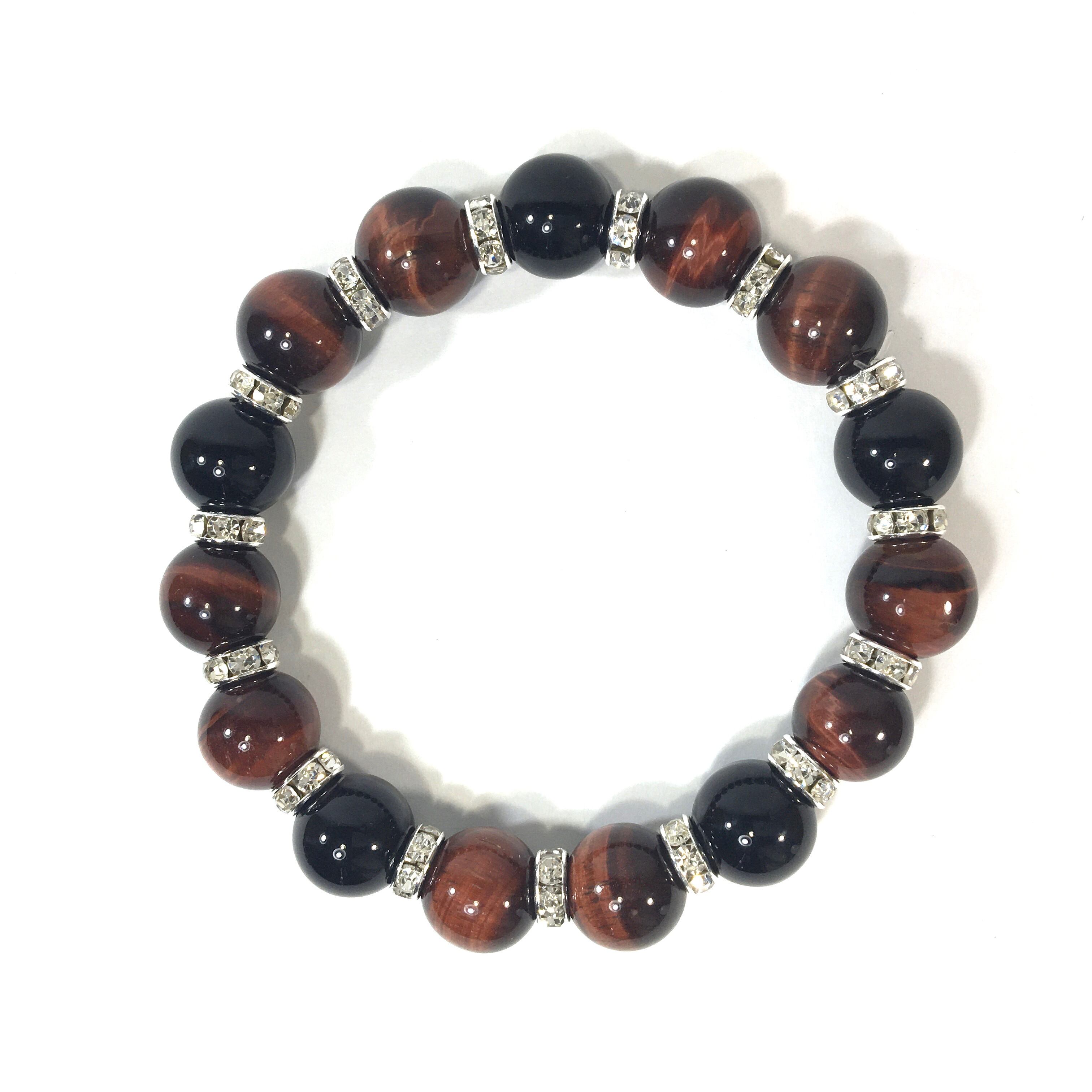 こちらは、レッドタイガーアイとオニキスを組み合わせたパワーストーンブレスレットです。間にはロンデルを挟み高級感あるデザインに仕上げております。石大きさは12mm玉を使用して内周約18cmです。気になる方は是非この機会にどうぞ。
