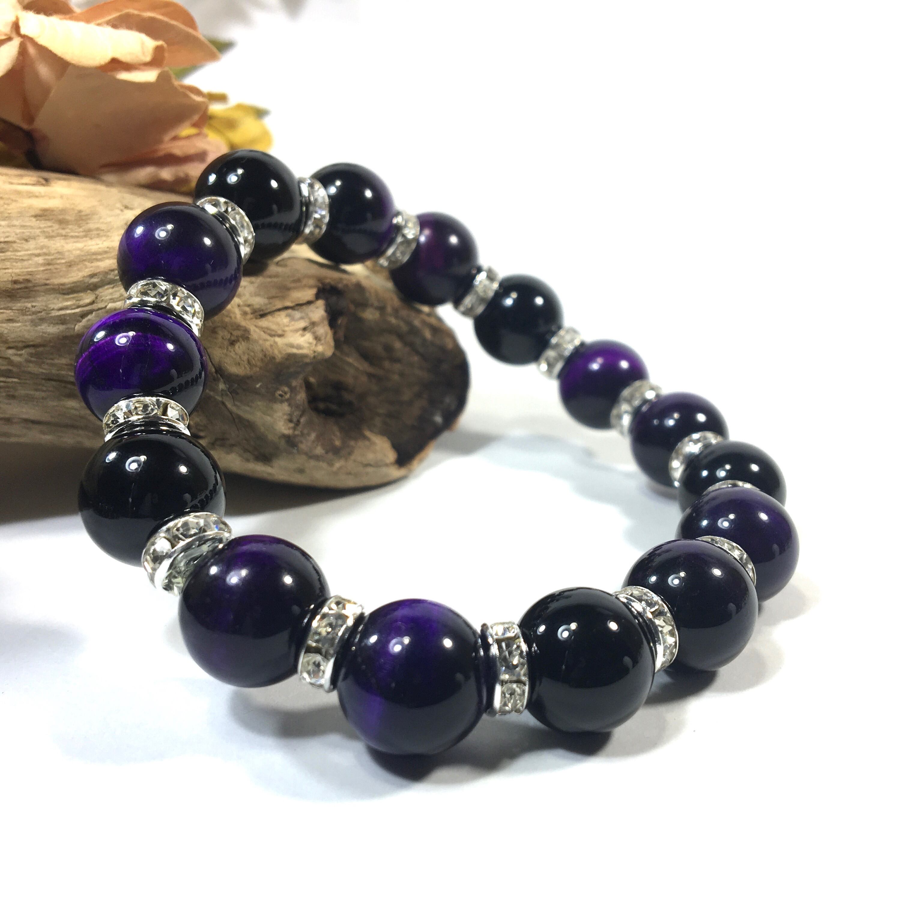 こちらは、パープルタイガーアイとオニキスを組み合わせたパワーストーンブレスレットです。間にはロンデルを挟み高級感あるデザインに仕上げております。石大きさは12mm玉を使用して内周約18cmです。気になる方は是非この機会にどうぞ。