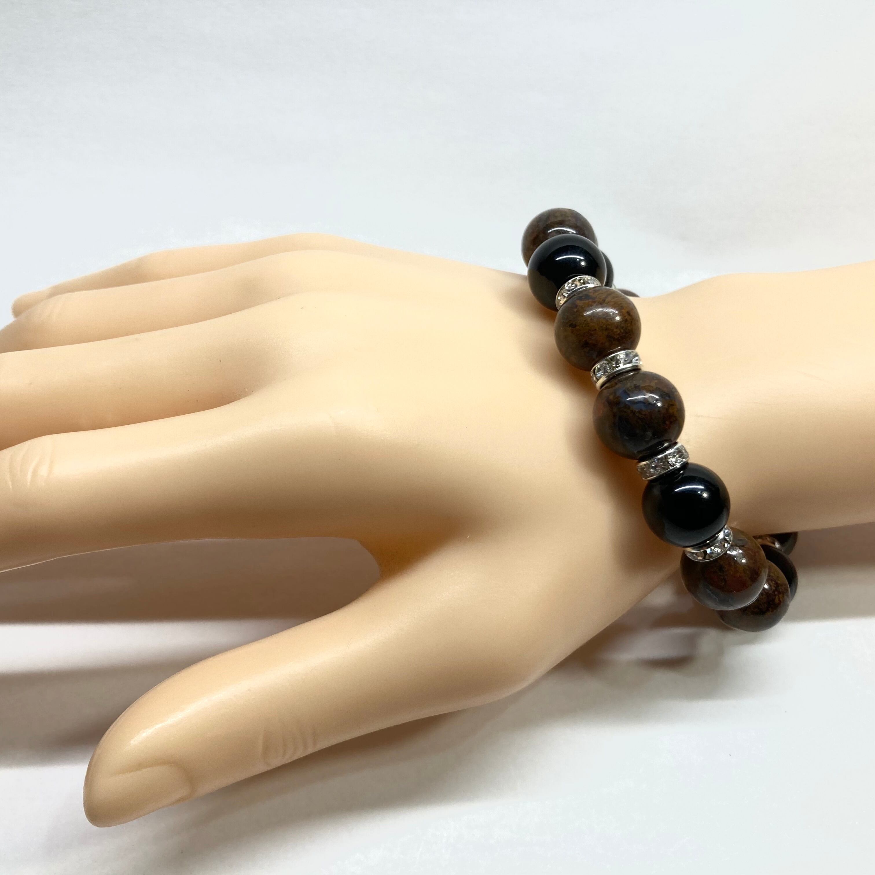 こちらは、10mm玉のピーターサイトとオニキスを組み合わせたパワーストーンブレスレットです。間にはロンデルを挟み高級感あるデザインに仕上げております。石大きさは12mm玉を使用して内径約18cmです。数に限りがございますので気になる方はお早めにどうぞ。