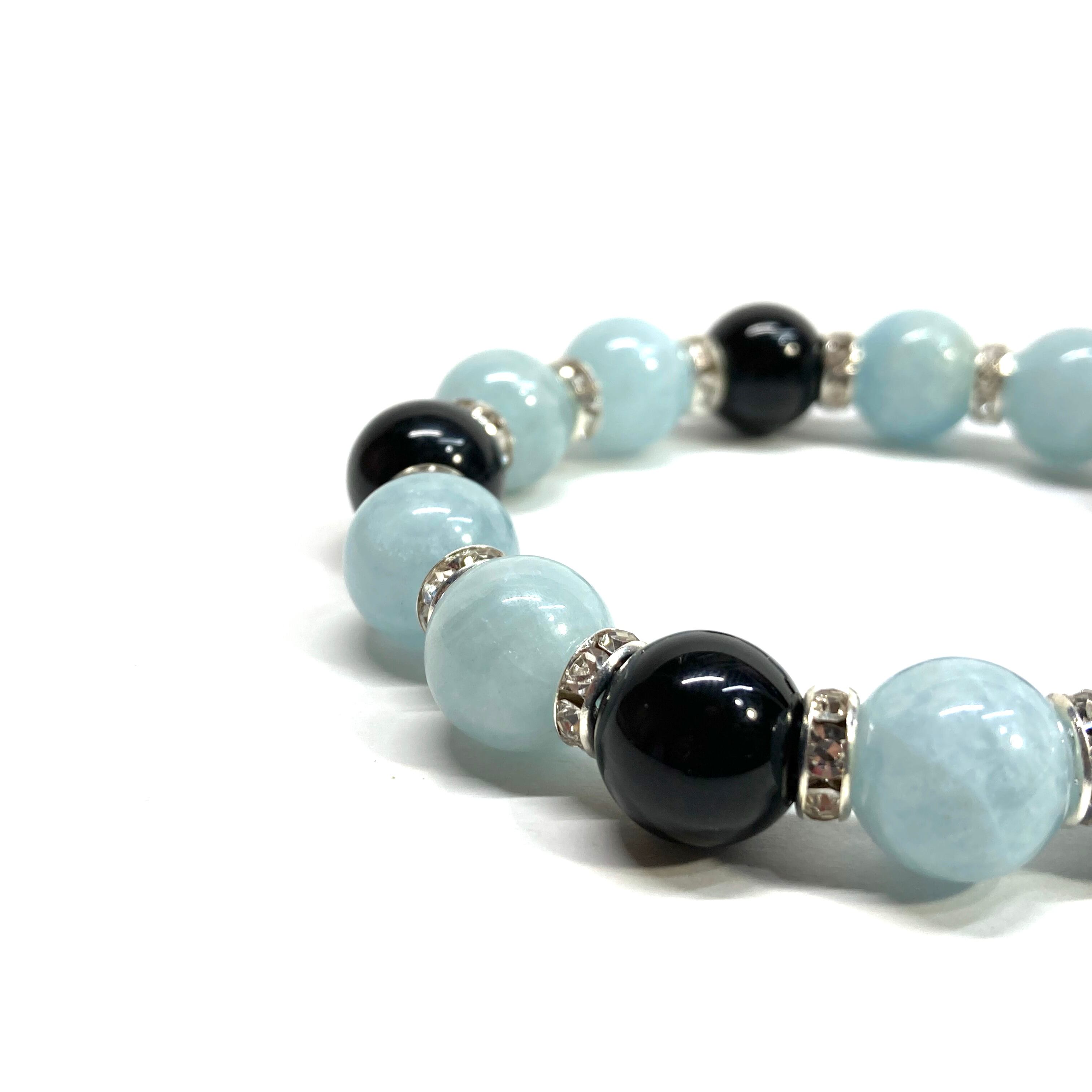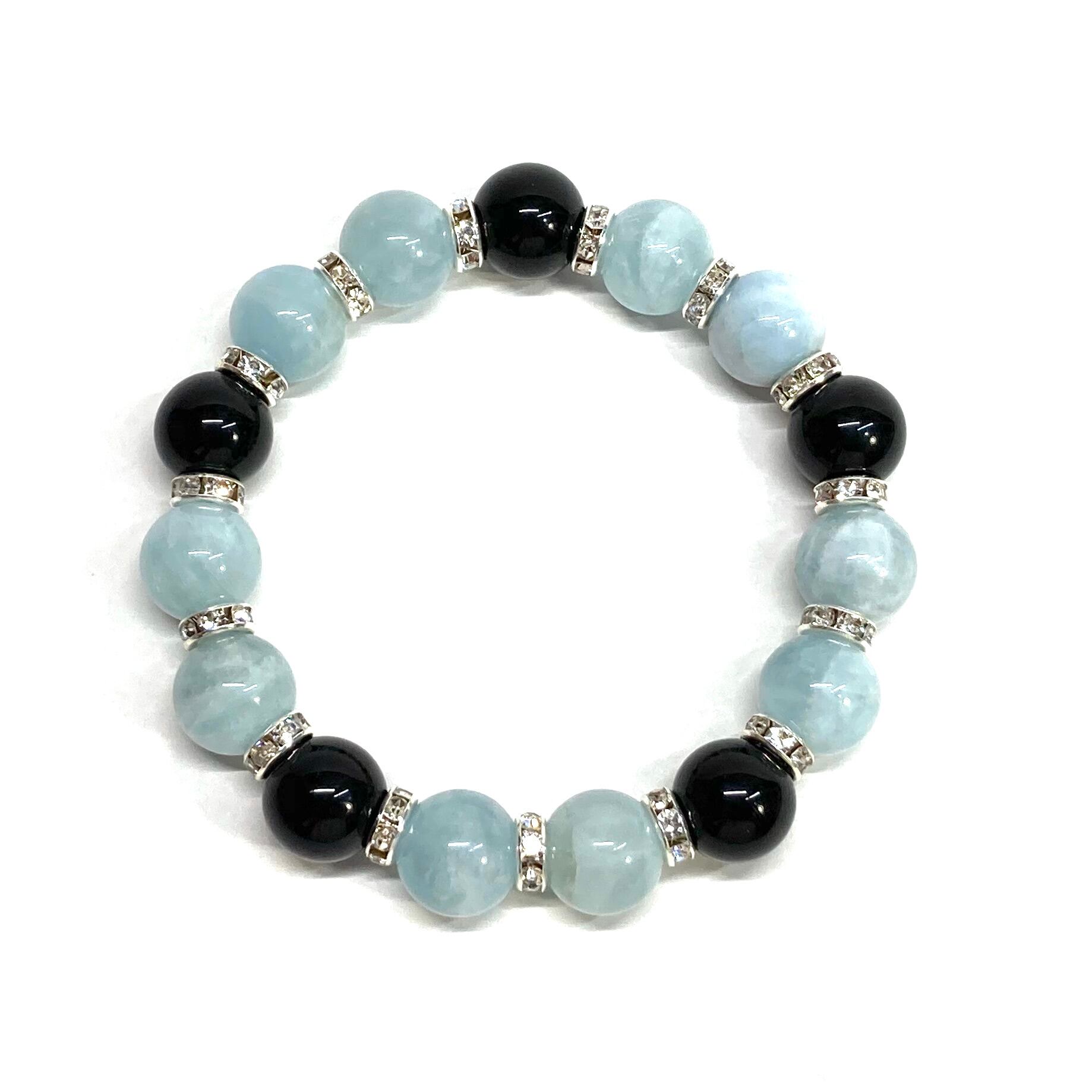 こちらは、12mm玉のアクアマリンと水晶を組み合わせたパワーストーンブレスレットです。間にはロンデルを挟み高級感あるデザインに仕上げております。石大きさは12mm玉を使用して内周約18cmです。気になる方は是非この機会にどうぞ。
