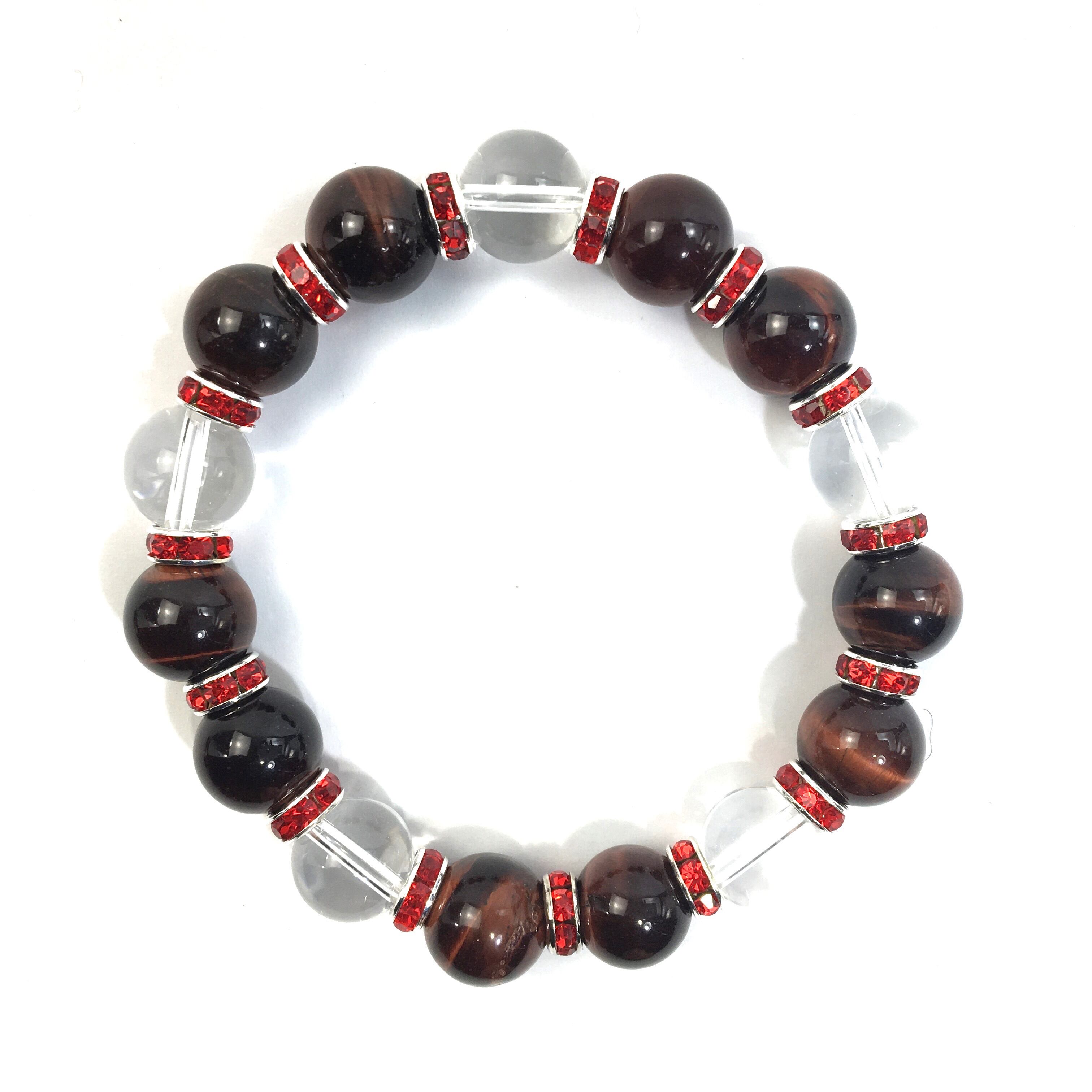 こちらは、レッドタイガーアイと水晶を組み合わせたパワーストーンブレスレットです。間にはロンデルを挟み高級感あるデザインに仕上げております。石大きさは12mm玉を使用して内周約18cmです。気になる方は是非この機会にどうぞ。