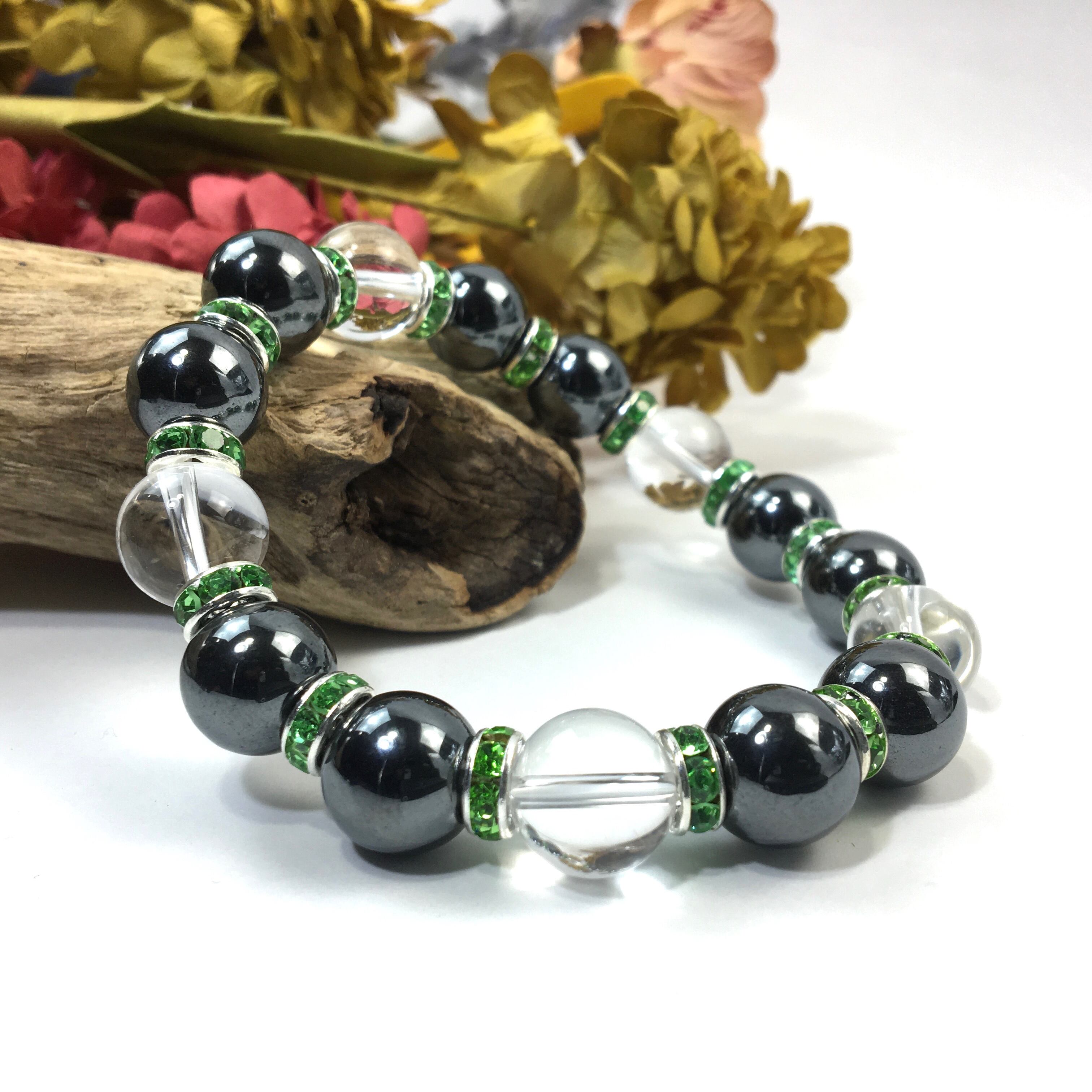 ヘマタイト&水晶 パワーストーン ブレスレット 天然石 12mm (グリーン)メンズ・レディース 男性・女性 数珠ブレス 開運 ☆
