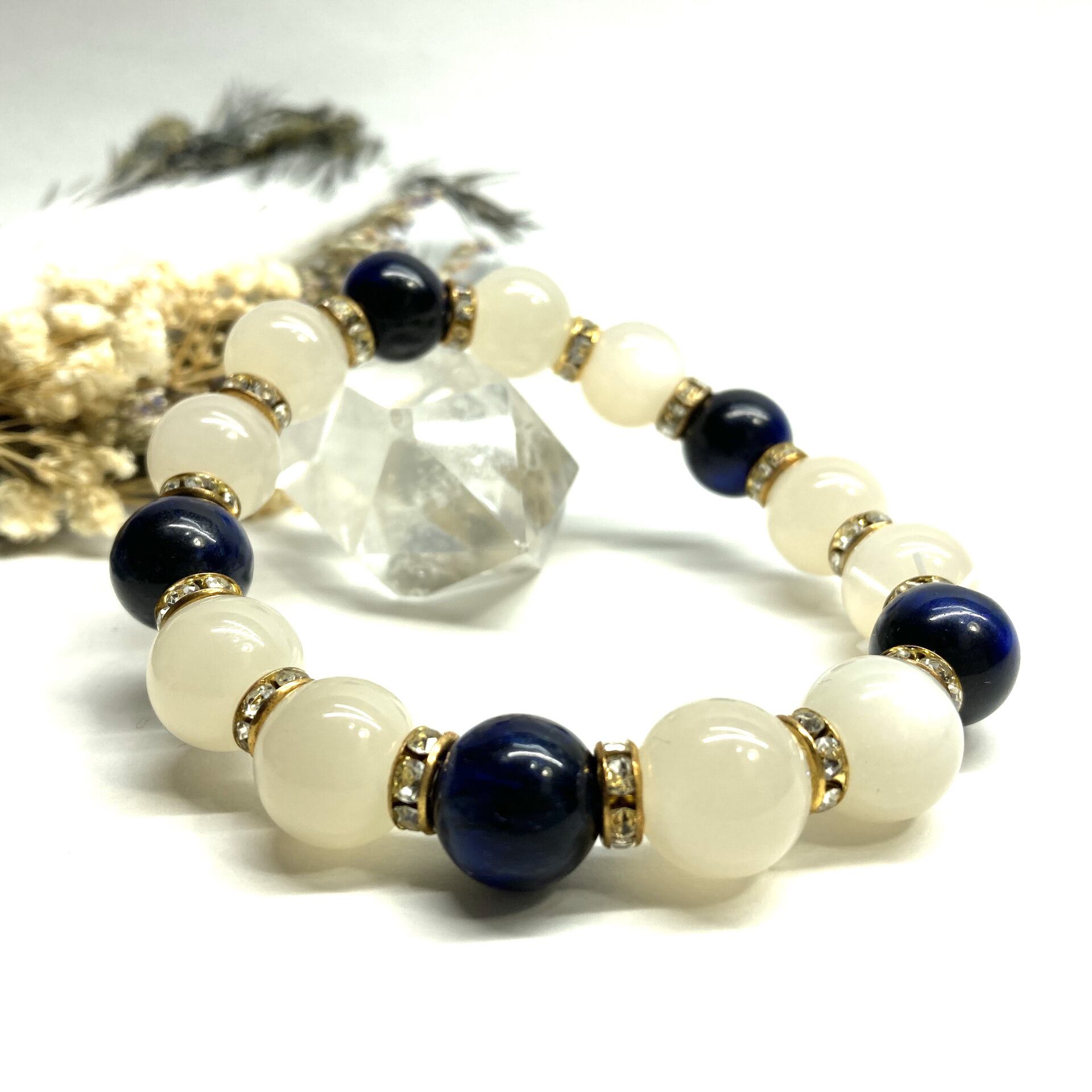 こちらは、ムーンストーンとグリーンタイガーアイを組み合わせたパワーストーンブレスレットです。間にはロンデルを挟み高級感あるデザインに仕上げております。石大きさは12mm玉を使用して内周 約18cmです。気になる方は是非この機会にどうぞ。