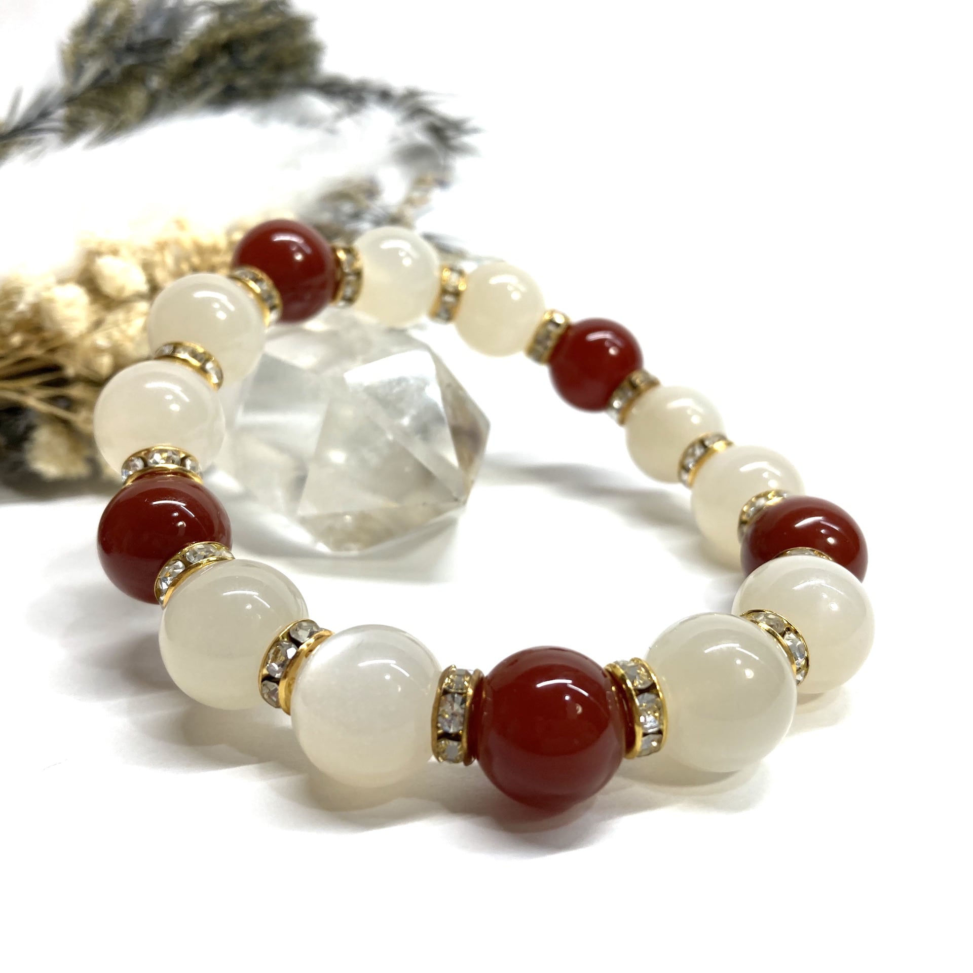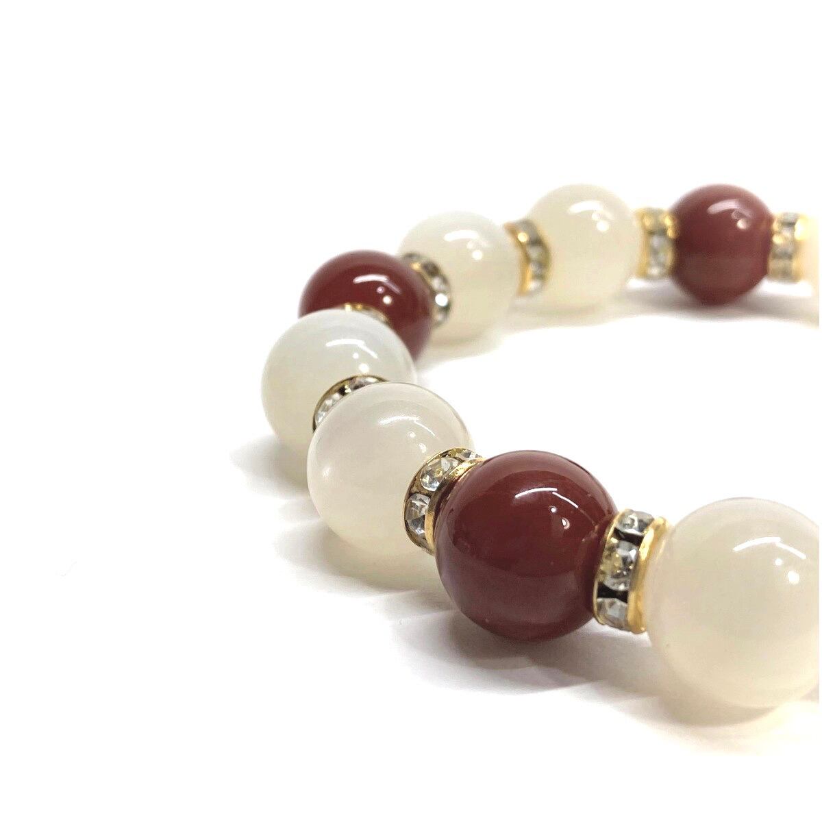こちらは、ムーンストーンと赤瑪瑙を組み合わせたパワーストーンブレスレットです。間にはロンデルを挟み高級感あるデザインに仕上げております。石大きさは12mm玉を使用して内周 約18cmです。気になる方は是非この機会にどうぞ。