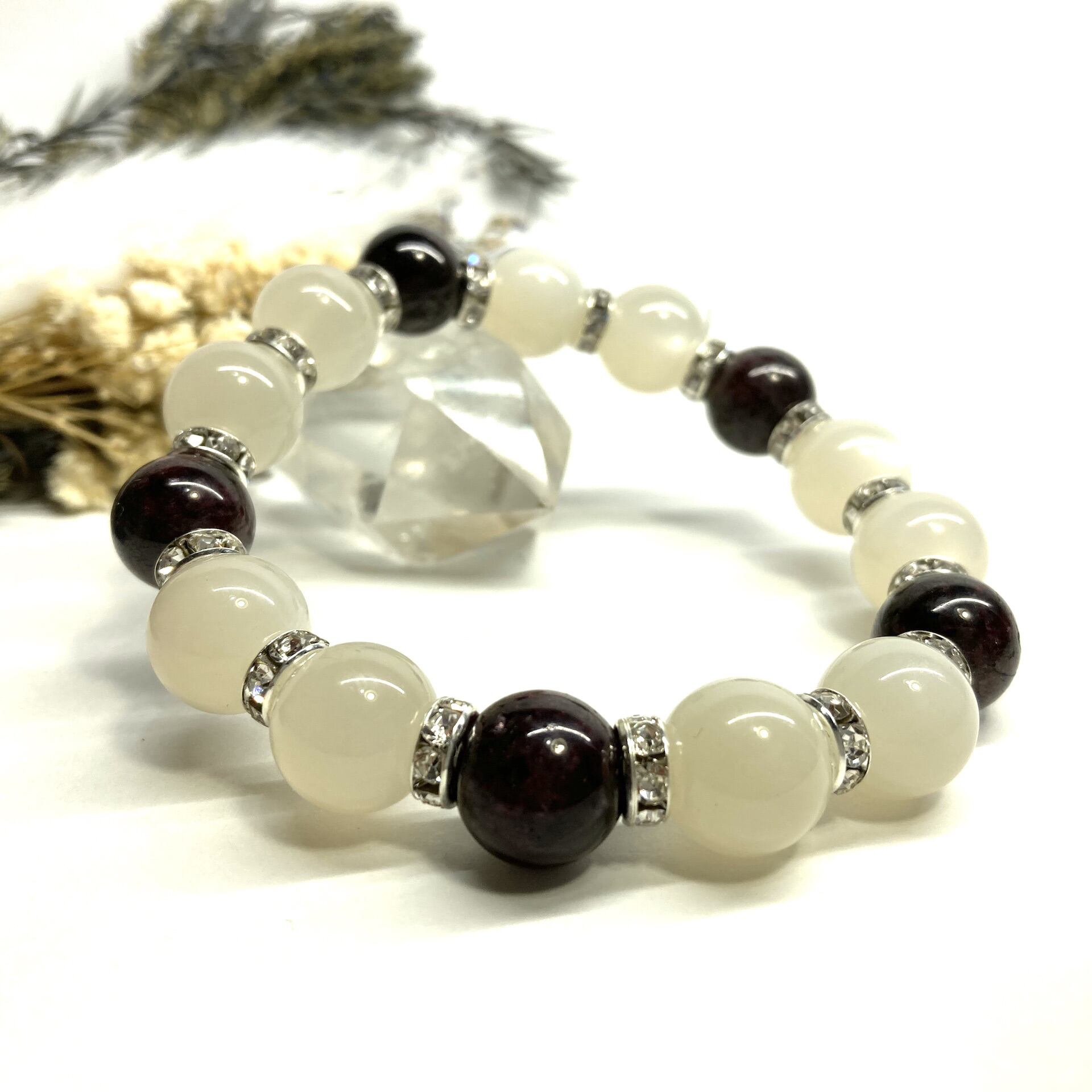こちらは、ムーンストーンとガーネットを組み合わせたパワーストーンブレスレットです。間にはロンデルを挟み高級感あるデザインに仕上げております。石大きさは12mm玉を使用して内周 約18cmです。気になる方は是非この機会にどうぞ。