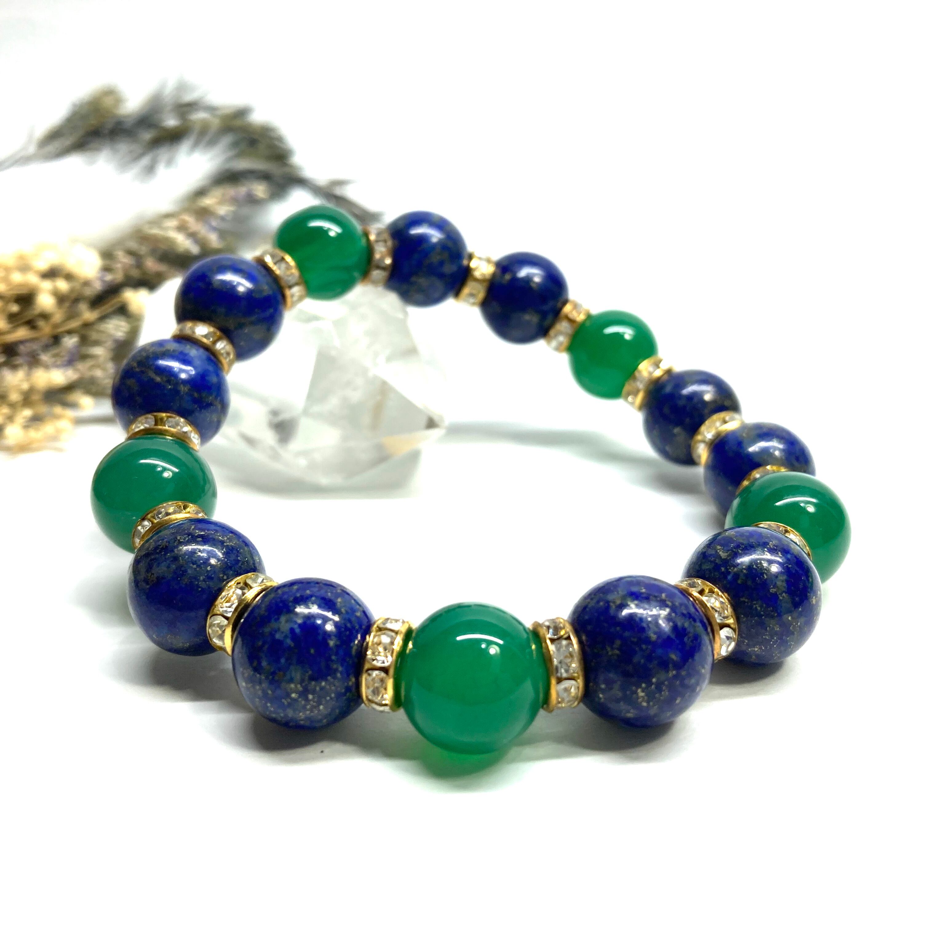 こちらは、ラピスラズリと緑瑪瑙を組み合わせたパワーストーンブレスレットです。間にはロンデルを挟み高級感あるデザインに仕上げております。石大きさは12mm玉を使用して内周 約18cmです。気になる方は是非この機会にどうぞ。