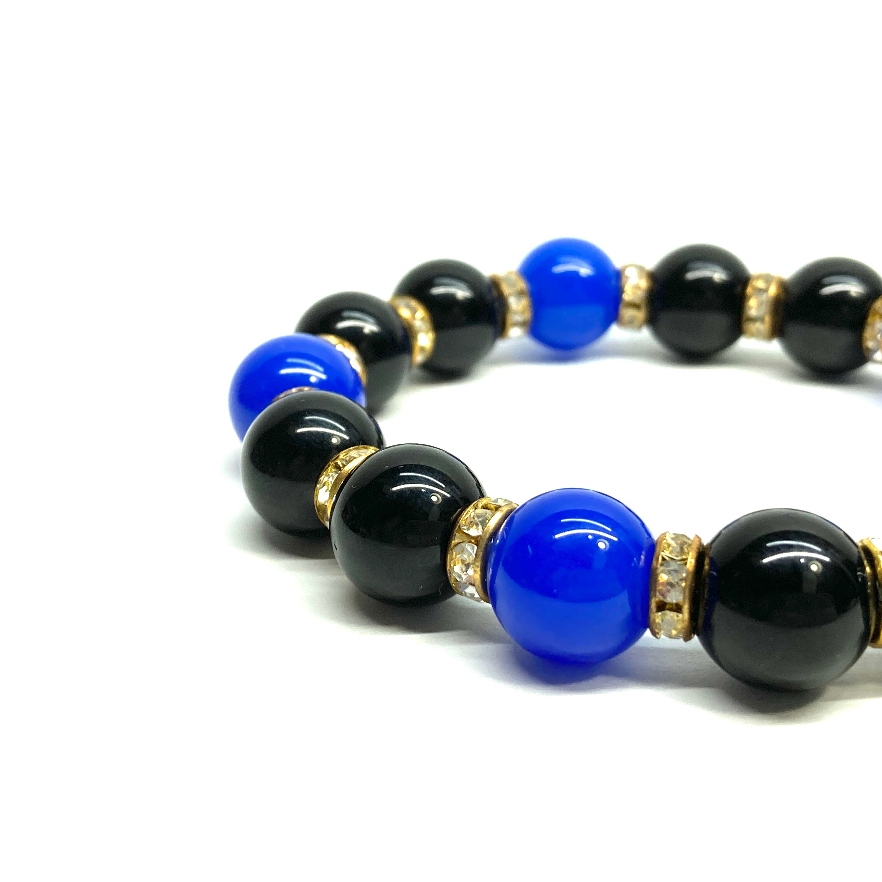 こちらは、モリオンと青瑪瑙を組み合わせたパワーストーンブレスレットです。間にはロンデルを挟み高級感あるデザインに仕上げております。石大きさは12mm玉を使用して内周 約18cmです。気になる方は是非この機会にどうぞ。