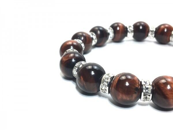 こちらは、12mm玉のレッドタイガーアイを使用した天然石ブレスレットです。石との間にはロンデルを挟み高級感を演出しています。シンプルなデザインですのでどんなコーディネートとも合わせ易いブレスレットです。石大きさは12mm玉です。内周約18cmです。気になる方は是非この機会にどうぞ。