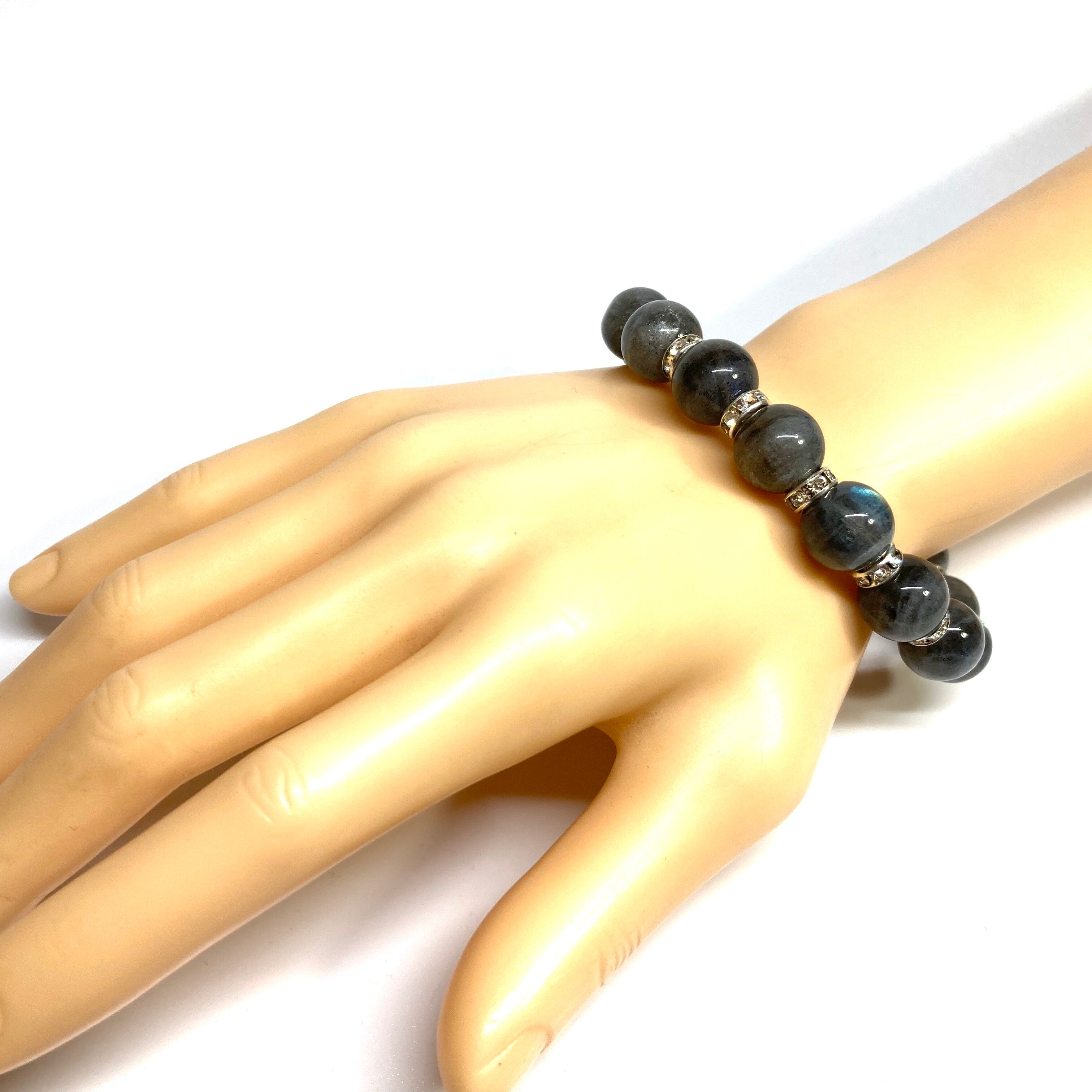 こちらは、12mm玉のラブラドライトを使用したブレスレットです。石との間にはロンデルを挟み高級感を演出しています。シンプルなデザインですのでどんなコーディネートとも合わせ易いブレスレットです。石大きさは12mm玉です。内周約18cmです。(サイズ変更の場合はメッセージにてご連絡をお願いします。) 数に限りがございますので気になる方はお早めにどうぞ。