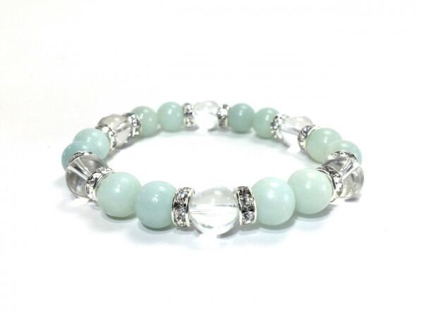 こちらは、アマゾナイトと水晶を組み合わせたブレスレットです。間にはロンデルを挟み高級感あるデザインに仕上がっています。石大きさは腕にも馴染みやすいように10mm玉で内周約17cm(伸可能)です。数に限りがございますので気になる方はお早めにどうぞ。