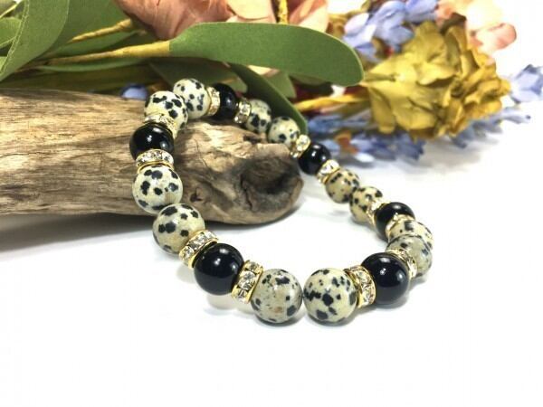 こちらは、ダルメシアンジャスパーとオニキスを組み合わせたブレスレットです。間にはロンデルを挟み高級感あるデザインに仕上がっています。石大きさは腕にも馴染みやすいように10mm玉で内周約17cm(伸可能)です。数に限りがございますので気になる方はお早めにどうぞ。
