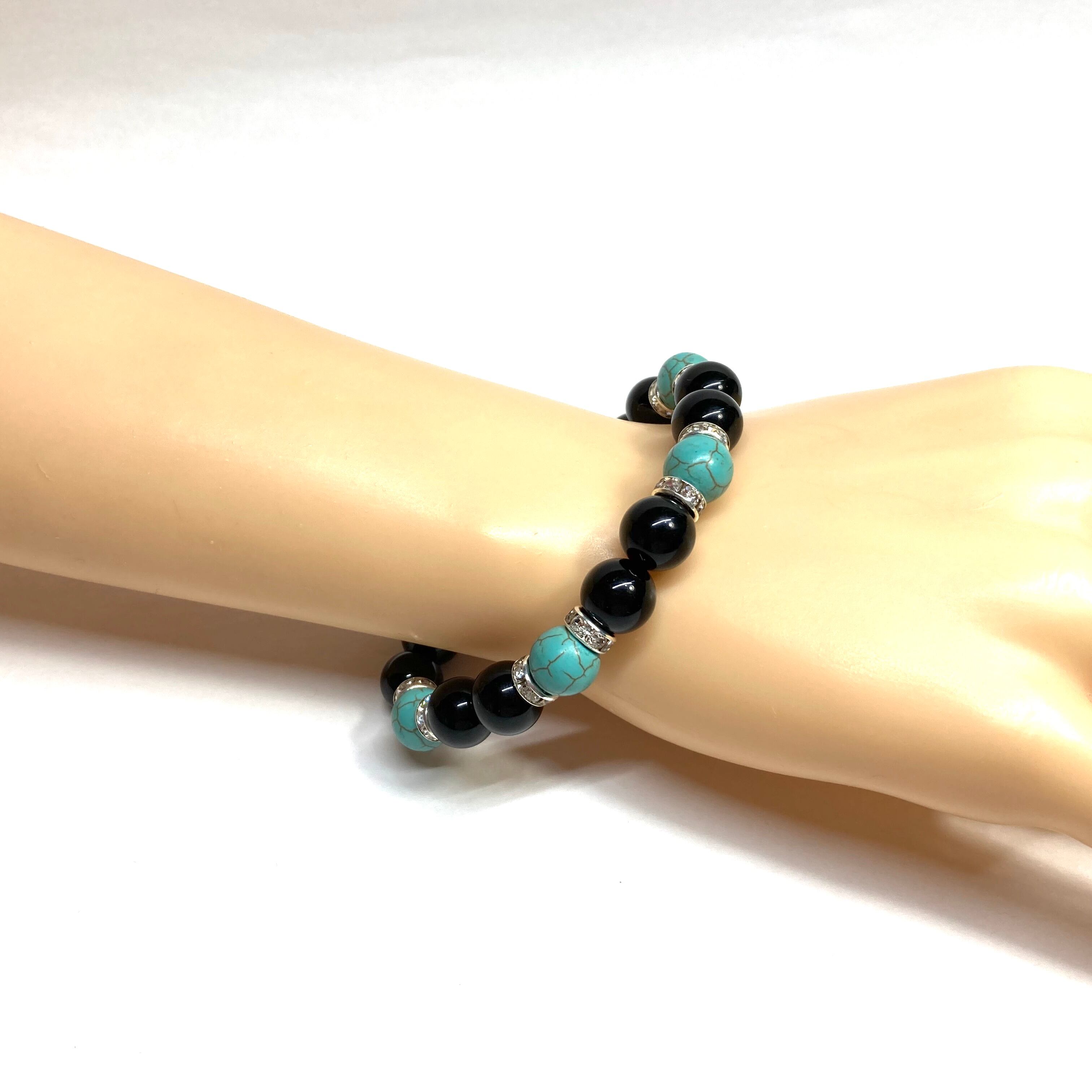 こちらは、モリオンとターコイズを組み合わせたパワーストーンブレスレットです。間にはロンデルを挟み高級感あるデザインに仕上げております。石大きさは腕にも馴染みやすいように10mm玉で内径約18cm(伸可能)です。 数に限りがございますので気になる方はお早めにどうぞ。