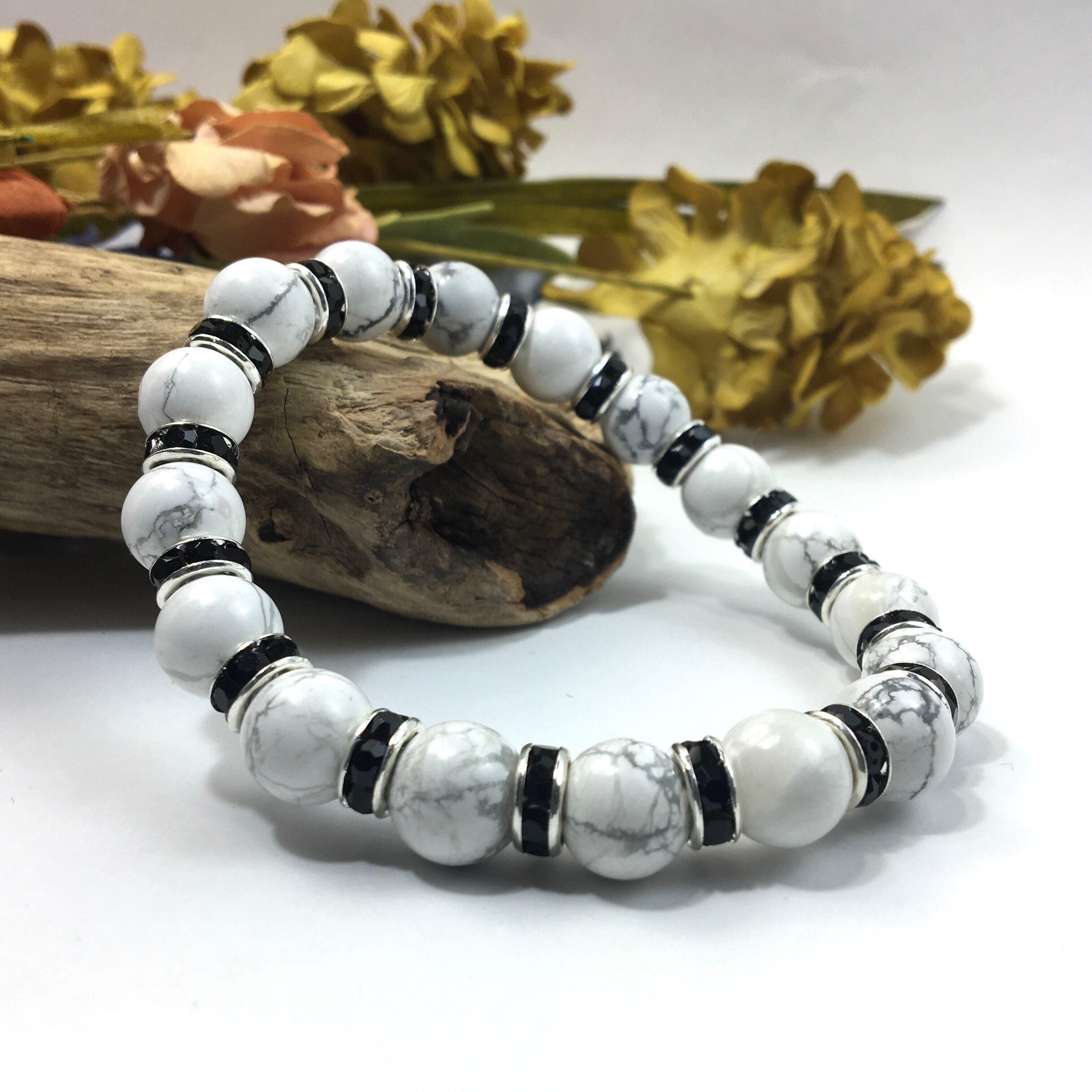 こちらは、ハウライトの10mm玉を使用したパワーストーンブレスレットです。石との間にはロンデルを挟み高級感を演出しております。シンプルなデザインは、シーン問わずどんなコーディネートとも合わせ易いブレスレットです。サイズは種類を選択からお選びください。(内周約14cm?内周約22cmでお選び頂けます)当社の中でも一番人気の実績があるデザインとなっております。気になる方はお早めにどうぞ。