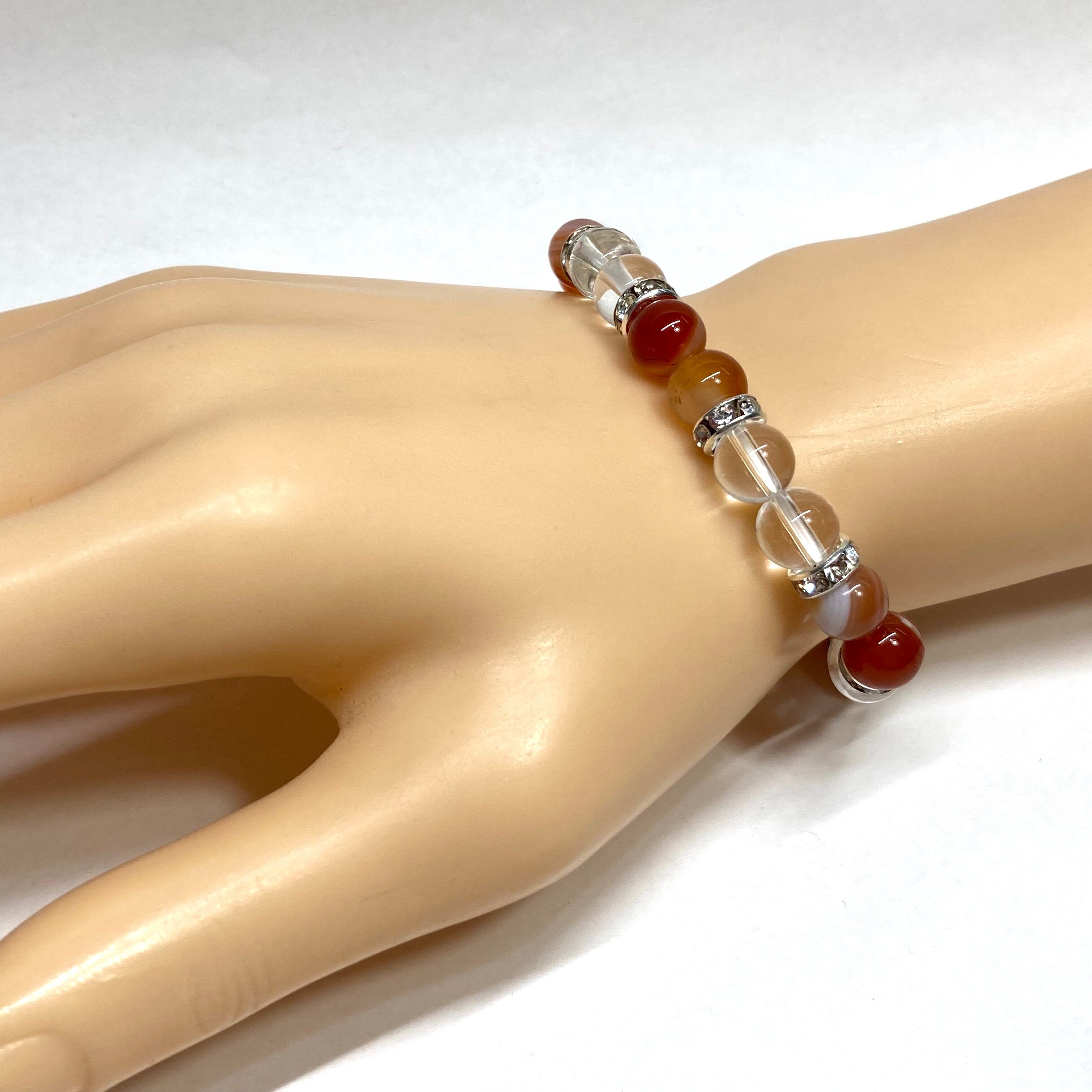 こちらは、8mm玉のカーネリアン・サードニクス(サードオニキス)と水晶を使用した天然石ブレスレットです。石との間に挟まれたロンデルがアクセントになったデザインです。サイズは内周約15cmです。