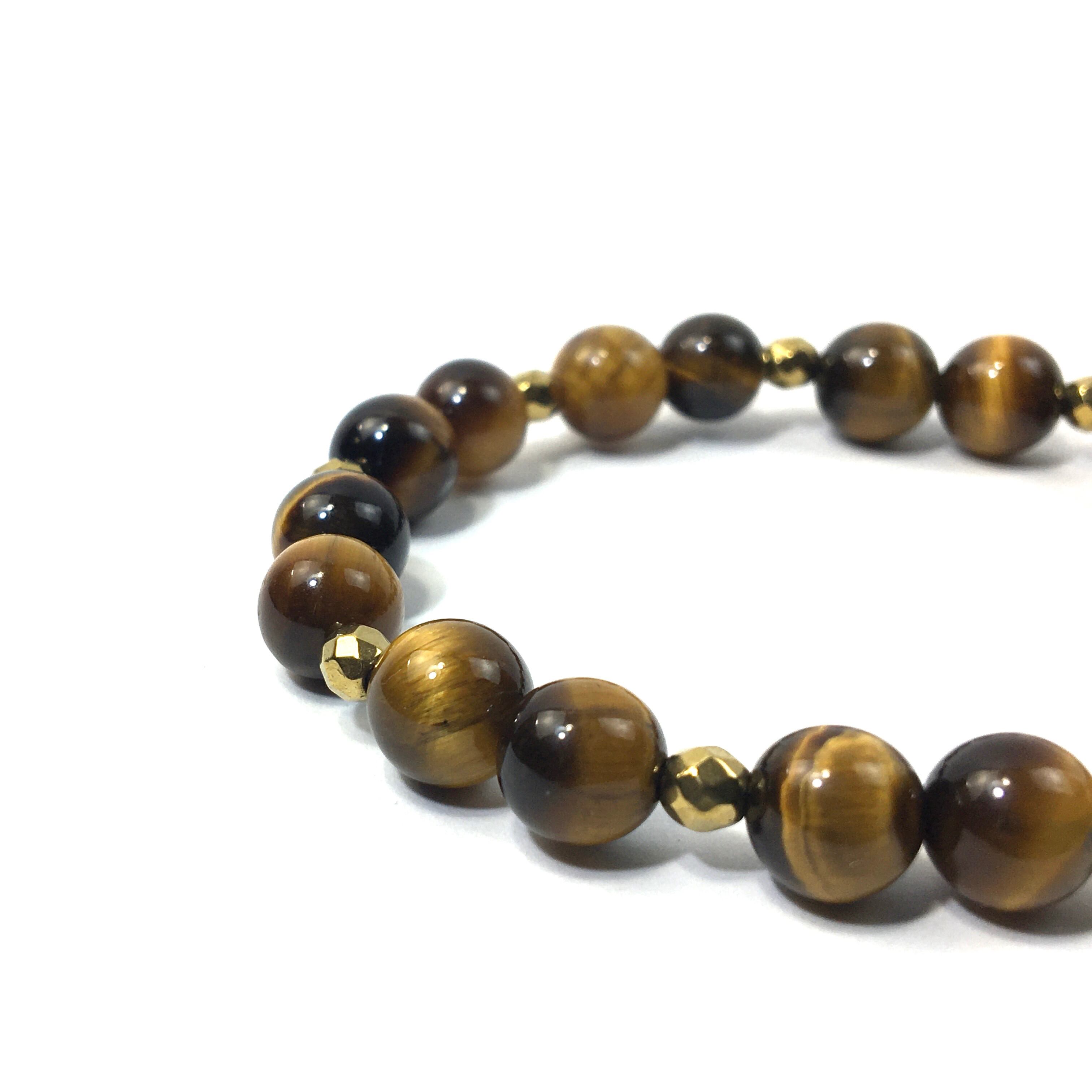 こちらは、8mm玉のタイガーアイを使ったパワーストーンブレスレットです。今回は石との間にはゴールドのヘマタイトを加えアクセントとしております。シンプルなデザインでどんなコーディネートにも合わせやすいデザインに仕上げています。サイズは内周約15cmです。気になる方は是非この機会にどうぞ。