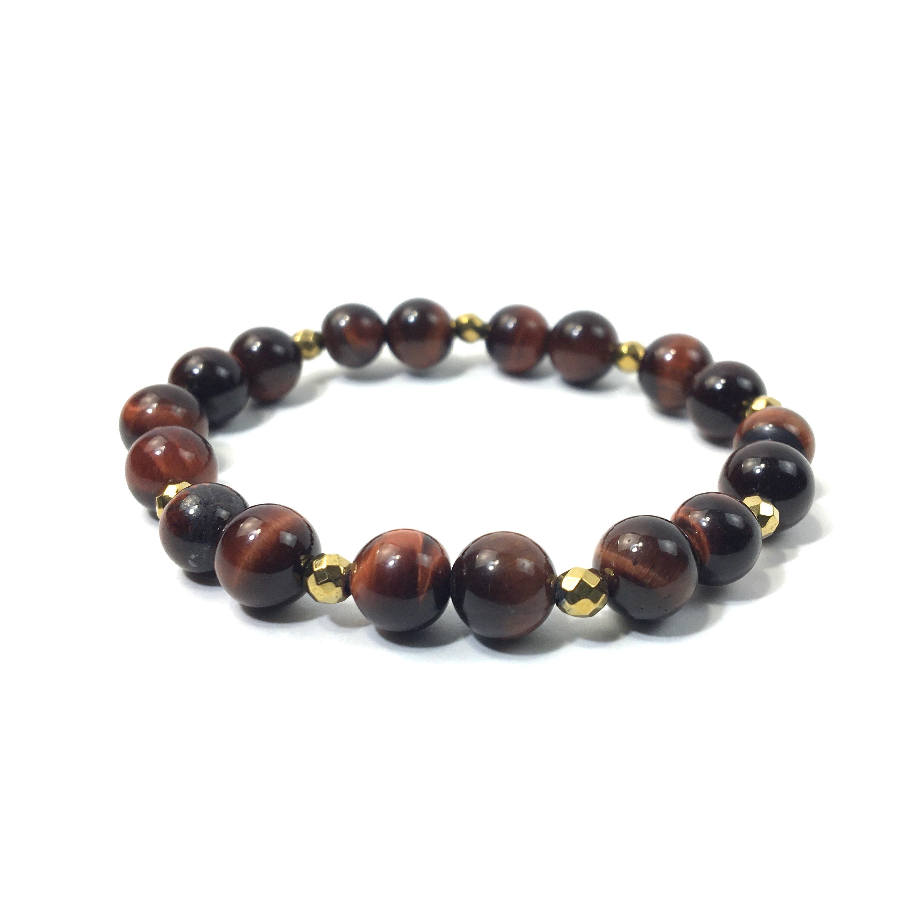 こちらは、8mm玉のレッドタイガーアイを使ったパワーストーンブレスレットです。今回は石との間にはゴールドのヘマタイトを加えアクセントとしております。シンプルなデザインでどんなコーディネートにも合わせやすいデザインに仕上げています。サイズは内周約15cmです。気になる方は是非この機会にどうぞ。