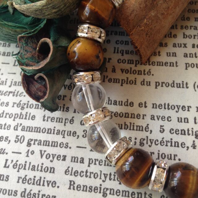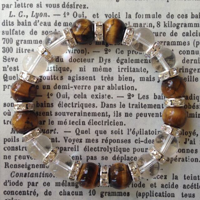 こちらは、タイガーアイと水晶のミックスブレスレットです。間にはシルバーのロンデルで高級感溢れるデザインに仕上がっています。石大きさは腕にも馴染みやすいように10mm玉で内周約18cm(伸可能)です。気になる方は是非この機会にどうぞ。