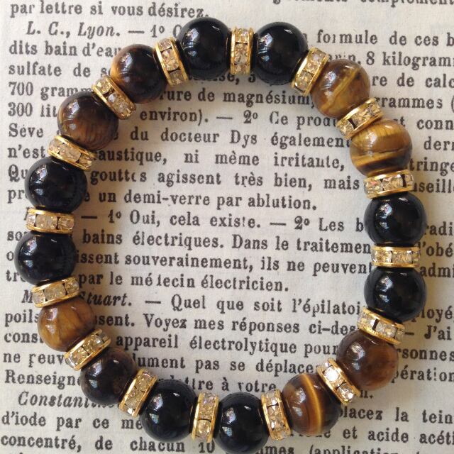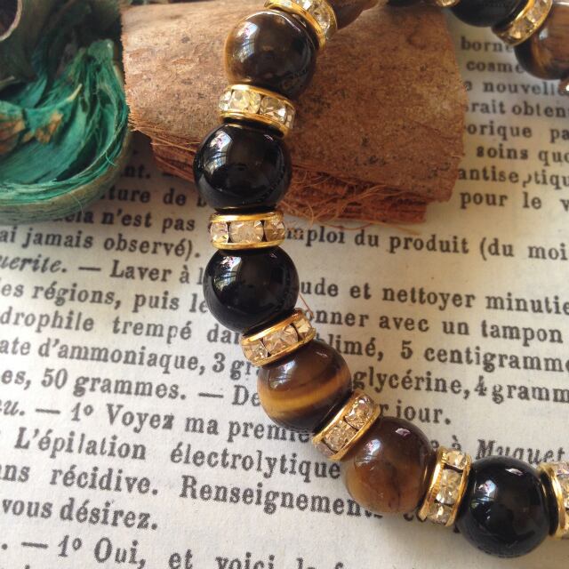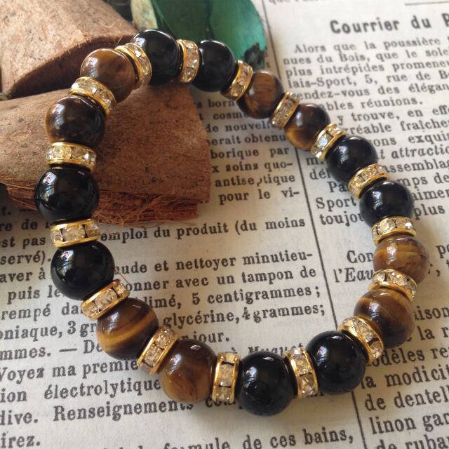こちらは、タイガーアイとオニキスのミックスブレスレットです。間にはゴールドのロンデルで高級感溢れるデザインに仕上がっています。石大きさは腕にも馴染みやすいように10mm玉で内周約18cm(伸可能)です。気になる方は是非この機会にどうぞ。