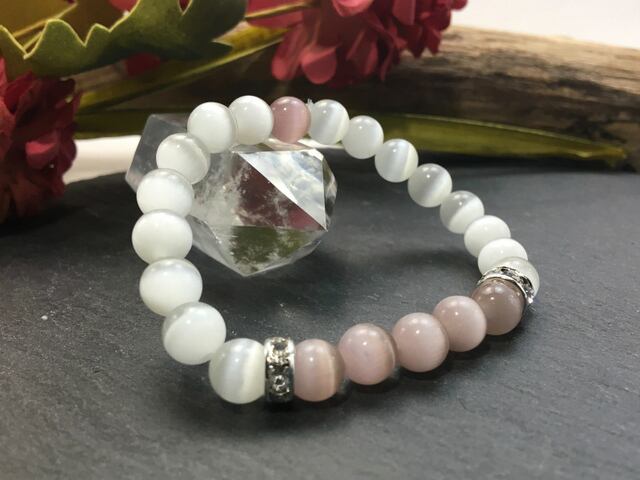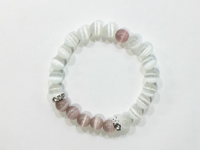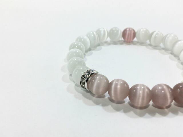 当ギャラリーの中でも人気のキャッツアイブレスレット。今回はキャッツアイの中でも人気の高いホワイトカラーをベースに差し色のカラーキャッツアイを追加して制作したアイテムです。是非この機会にどうぞ。何本かブレスレットを重ねつけして楽しむのもおすすめです。