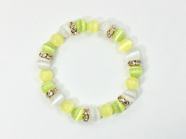 こちらは、8mm玉のライムグリーンキャッツアイ、イエローキャッツアイとホワイトキャッツアイを使用したパワーストーンブレスレットです。間にはゴールドのロンデルを挟み高級感ある大人っぽいデザインに仕上がっています。内周約14cm±0.3cm(伸可能)です。気になる方は是非この機会にどうぞ。