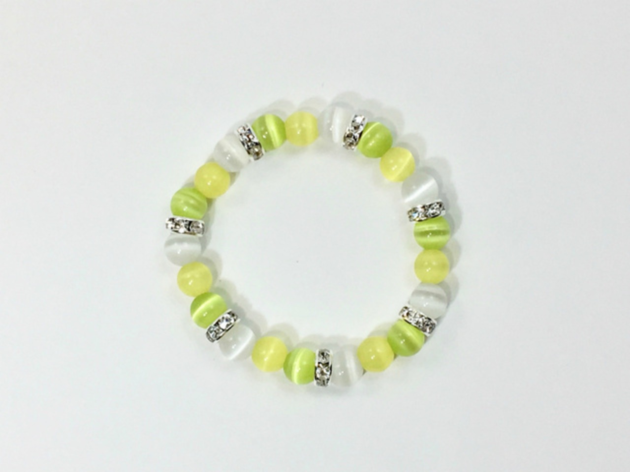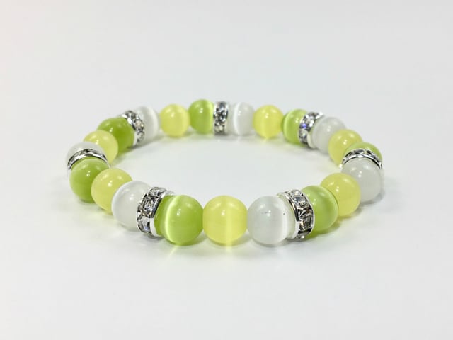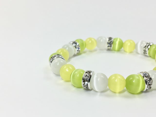 こちらは、8mm玉のライムグリーンキャッツアイ、イエローキャッツアイとホワイトキャッツアイを使用したパワーストーンブレスレットです。間にはシルバーのロンデルを挟み高級感ある大人っぽいデザインに仕上がっています。内周約14cm±0.3cm(伸可能)です。気になる方は是非この機会にどうぞ。