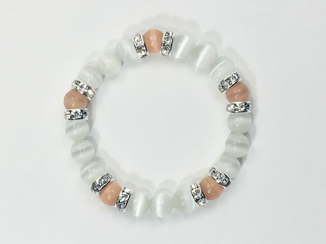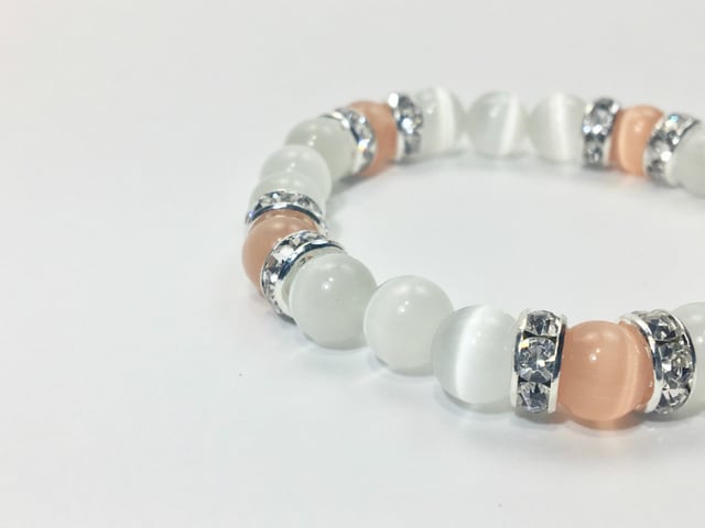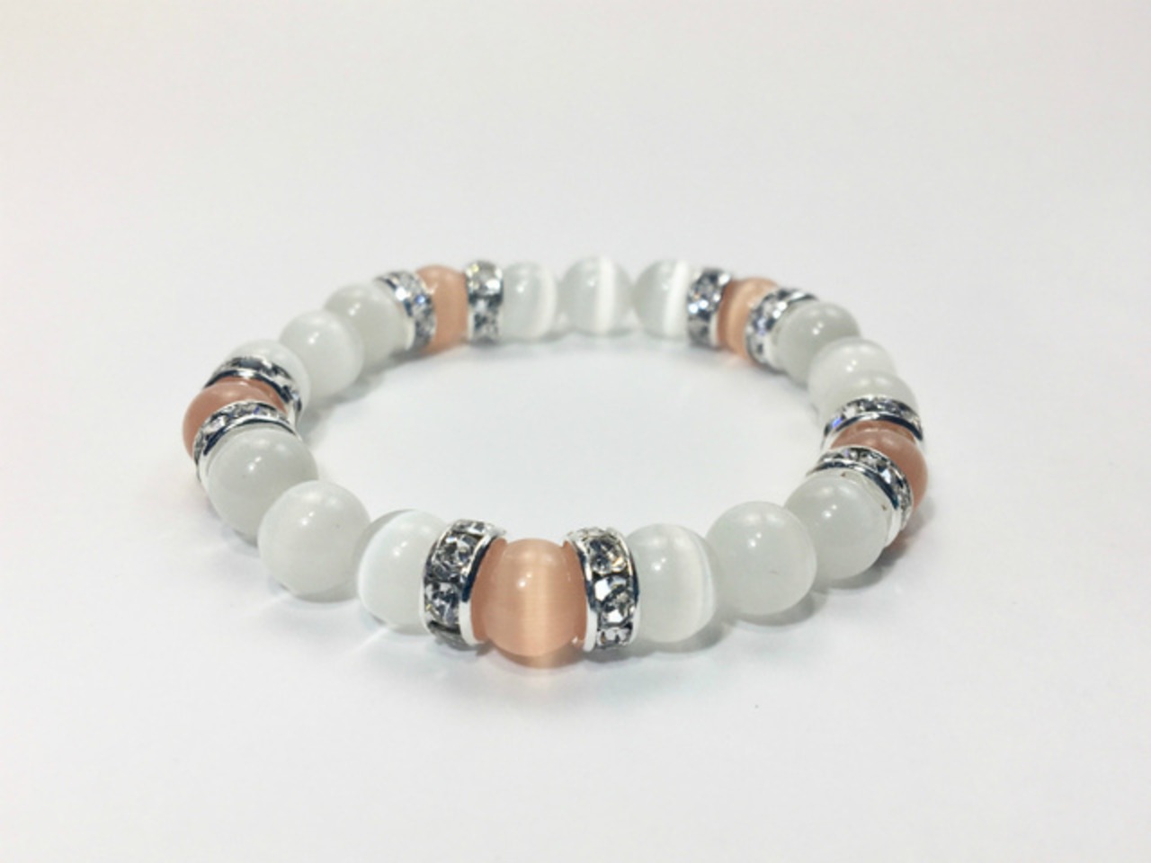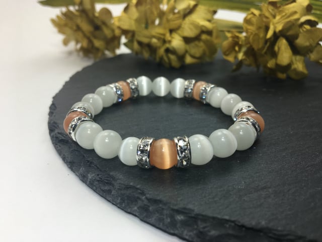 こちらは、8mm玉のオレンジキャッツアイとホワイトキャッツアイを組み合わせたパワーストーンブレスレットです。今回は五芒星デザインで石を配置しております。五芒星とは、陰陽道の基本概念となった陰陽五行説、木・火・土・金・水の5つの元素の働きの相克を表したものであり、五芒星は厄除・開運を願うデザインと重宝されているデザインです。サイズは内周約14cm±0.3cm(伸可能)です。気になる方は是非この機会にどうぞ。
