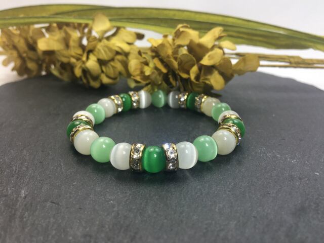 こちらは、8mm玉のグリーンキャッツアイとホワイトキャッツアイ、ライトグリーンキャッツアイを組み合わせたパワーストーンブレスレットです。今回は五芒星デザインで石を配置しております。五芒星とは、陰陽道の基本概念となった陰陽五行説、木・火・土・金・水の5つの元素の働きの相克を表したものであり、五芒星は厄除・開運を願うデザインと重宝されているデザインです。サイズは内周約14cm±0.3cm(伸可能)です。気になる方は是非この機会にどうぞ。