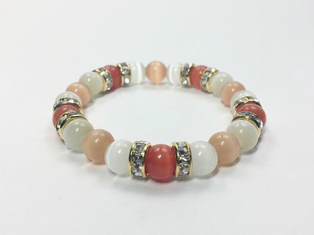 こちらは、8mm玉のレッドキャッツアイとホワイトキャッツアイ、オレンジキャッツアイを組み合わせたパワーストーンブレスレットです。今回は五芒星デザインで石を配置しております。五芒星とは、陰陽道の基本概念となった陰陽五行説、木・火・土・金・水の5つの元素の働きの相克を表したものであり、五芒星は厄除・開運を願うデザインと重宝されているデザインです。サイズは内周約14cm±0.3cm(伸可能)です。気になる方は是非この機会にどうぞ。