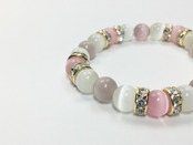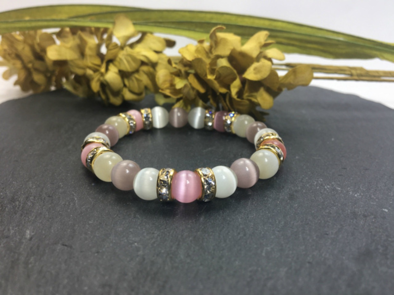 こちらは、8mm玉のピンクキャッツアイとホワイトキャッツアイ、ライトパープルキャッツアイを組み合わせたパワーストーンブレスレットです。今回は五芒星デザインで石を配置しております。五芒星とは、陰陽道の基本概念となった陰陽五行説、木・火・土・金・水の5つの元素の働きの相克を表したものであり、五芒星は厄除・開運を願うデザインと重宝されているデザインです。サイズは内周約14cm±0.3cm(伸可能)です。気になる方は是非この機会にどうぞ。