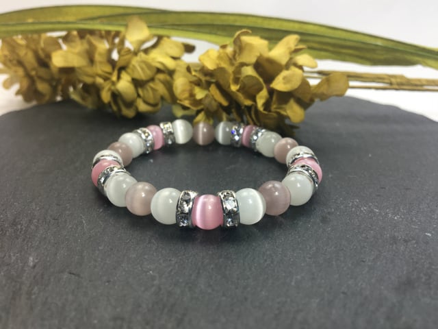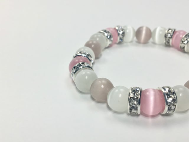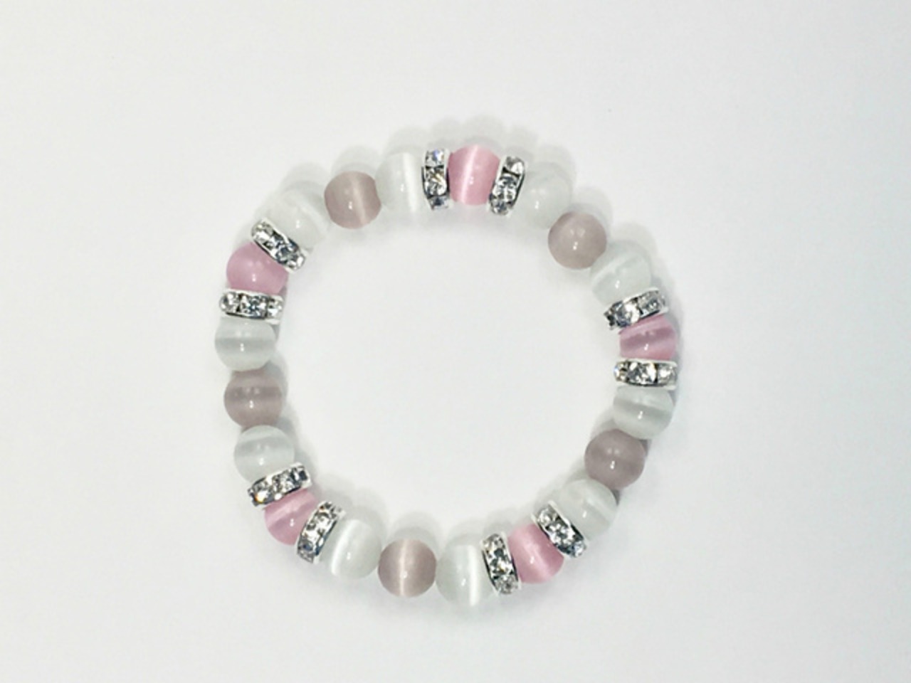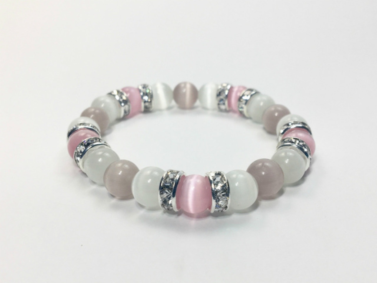 こちらは、8mm玉のピンクキャッツアイとホワイトキャッツアイ、ライトパープルキャッツアイを組み合わせたパワーストーンブレスレットです。今回は五芒星デザインで石を配置しております。五芒星とは、陰陽道の基本概念となった陰陽五行説、木・火・土・金・水の5つの元素の働きの相克を表したものであり、五芒星は厄除・開運を願うデザインと重宝されているデザインです。サイズは内周約14cm±0.3cm(伸可能)です。気になる方は是非この機会にどうぞ。