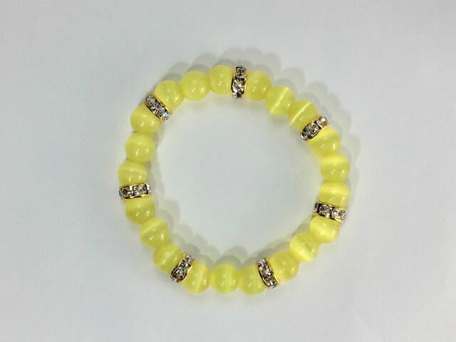 こちらは、8mm玉のイエローキャッツアイを使用したパワーストーンブレスレットです。間にはゴールドのロンデルを挟み高級感ある大人っぽいデザインに仕上がっています。内周約14cm±0.3cm(伸可能)です。気になる方は是非この機会にどうぞ。