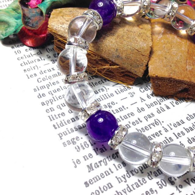 こちらは、10mm玉の水晶と10mm玉のアメジストを組み合わせた天然石ブレスレットです。間にはシルバーのロンデルを挟み高級感あるデザインに仕上がったブレスレットです。石大きさは腕にも馴染みやすいように10mm玉で内周約18cm(伸可能)です。気になる方は是非この機会にどうぞ。
