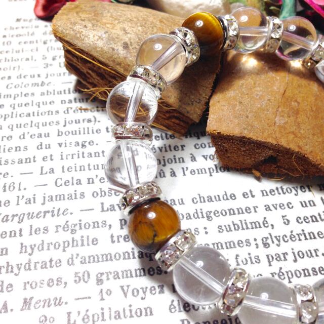 こちらは、10mm玉の水晶と10mm玉のタイガーアイを組み合わせた天然石ブレスレットです。間にはシルバーのロンデルを挟み高級感あるデザインに仕上がったブレスレットです。石大きさは腕にも馴染みやすいように10mm玉で内周約18cm(伸可能)です。気になる方は是非この機会にどうぞ。