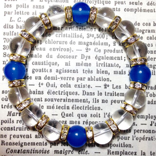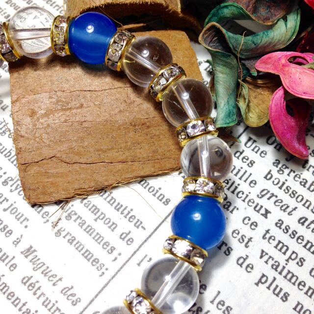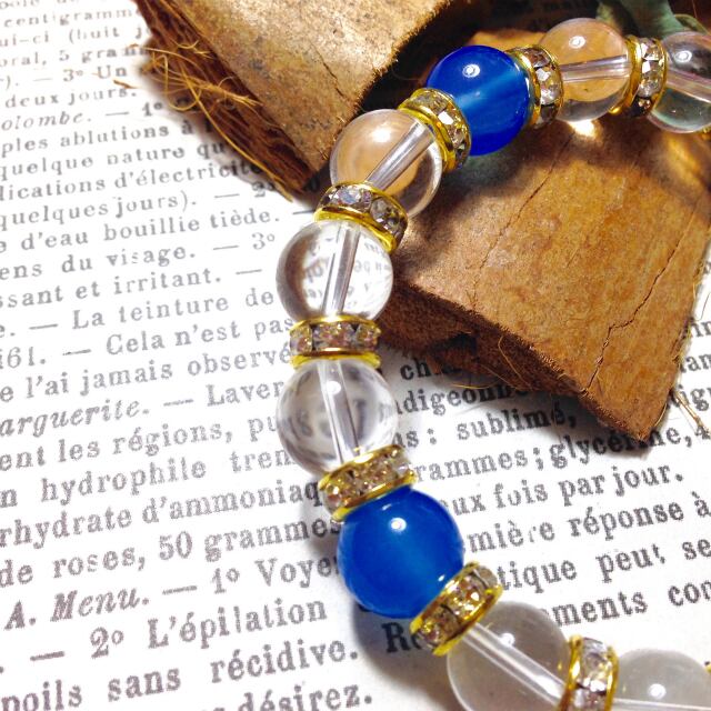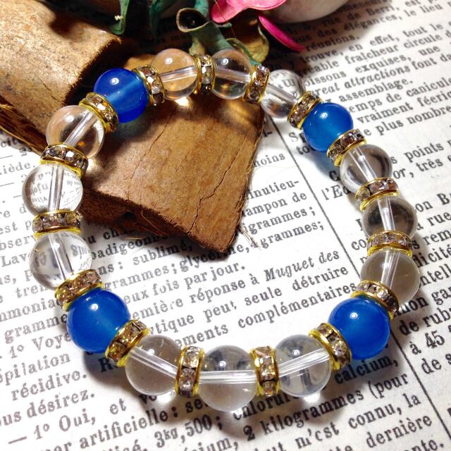 こちらは、10mm玉の水晶と10mm玉のブルーアゲートを組み合わせた天然石ブレスレットです。間にはゴールドのロンデルを挟み高級感あるデザインに仕上がったブレスレットです。石大きさは腕にも馴染みやすいように10mm玉で内周約18cm(伸可能)です。気になる方は是非この機会にどうぞ。
