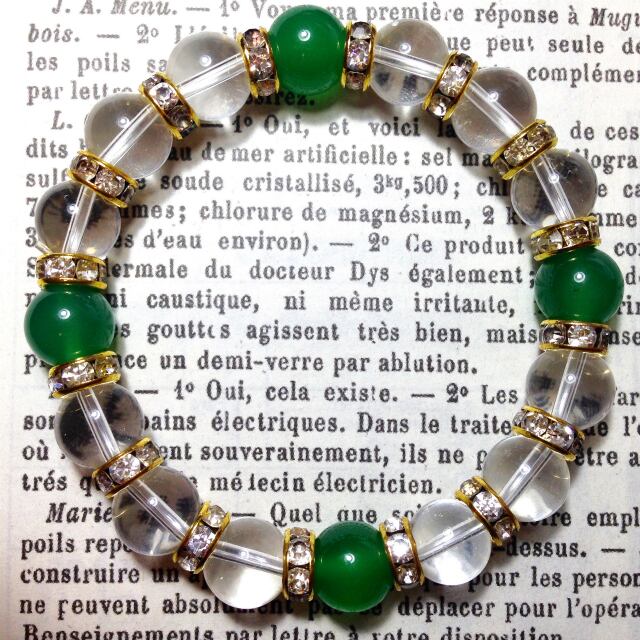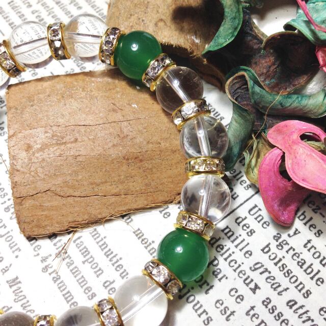 こちらは、10mm玉の水晶と10mm玉のグリーンアゲートを組み合わせた天然石ブレスレットです。間にはゴールドのロンデルを挟み高級感あるデザインに仕上がったブレスレットです。石大きさは腕にも馴染みやすいように10mm玉で内周約18cm(伸可能)です。気になる方は是非この機会にどうぞ。