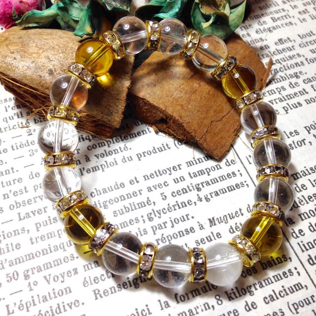 こちらは、10mm玉の水晶と10mm玉のシトリンを組み合わせた天然石ブレスレットです。間にはゴールドのロンデルを挟み高級感あるデザインに仕上がったブレスレットです。石大きさは腕にも馴染みやすいように10mm玉で内周約18cm(伸可能)です。気になる方は是非この機会にどうぞ。
