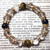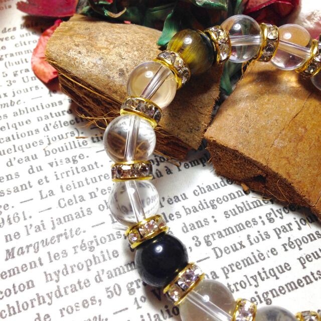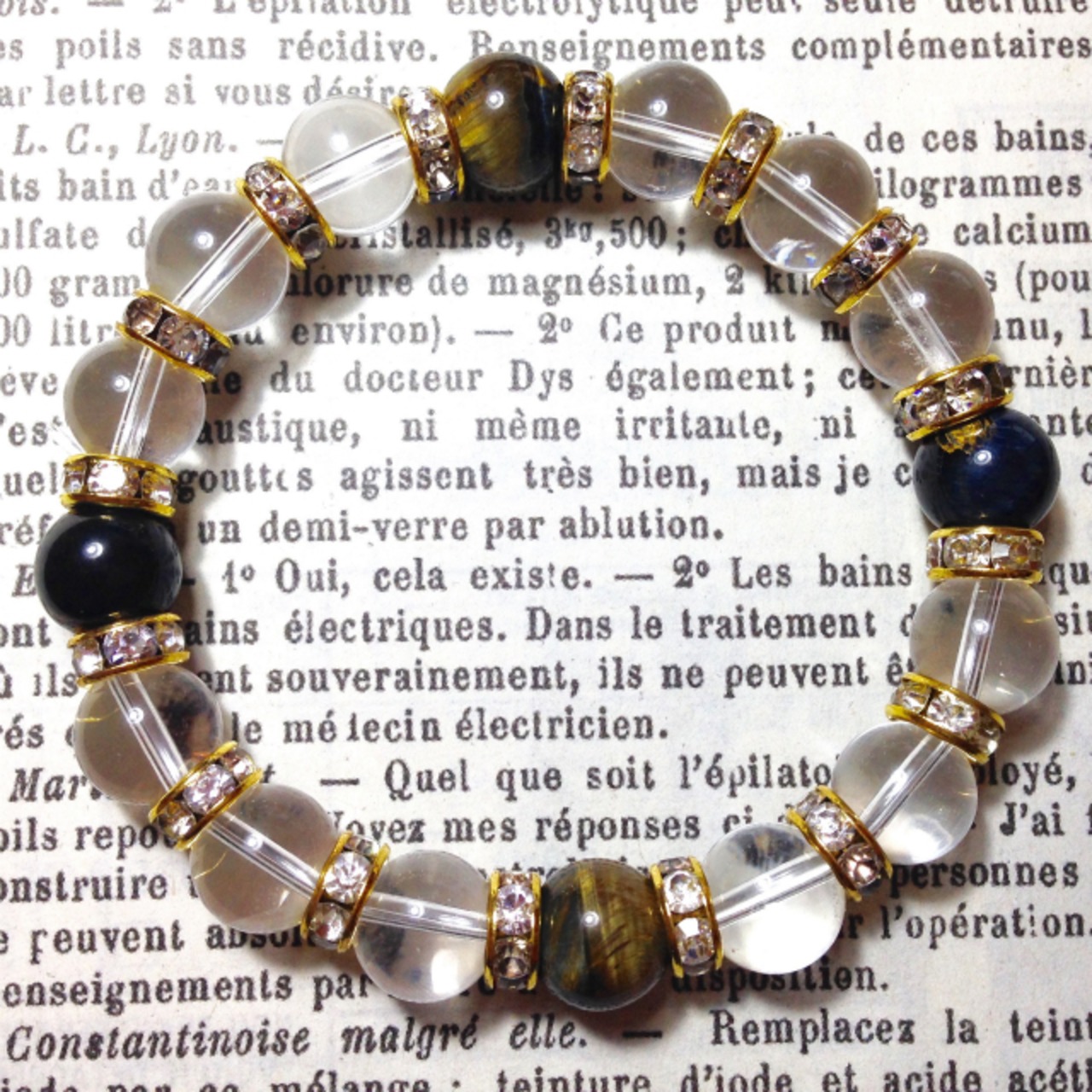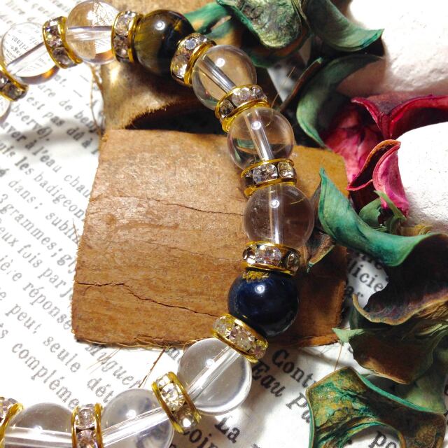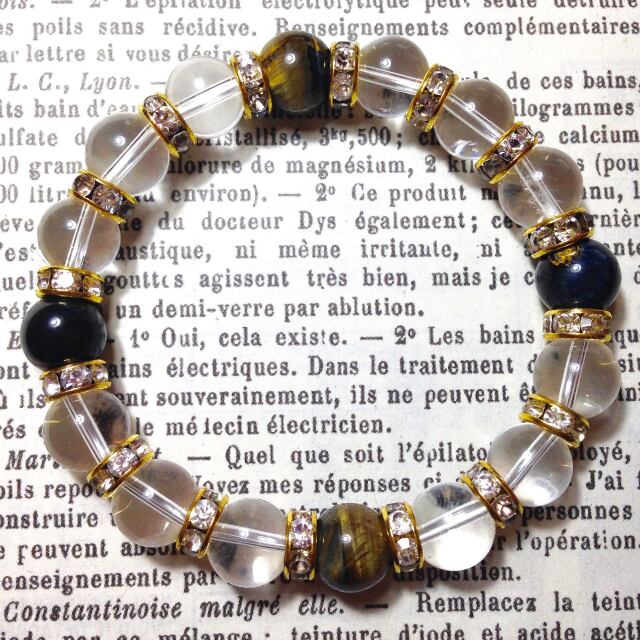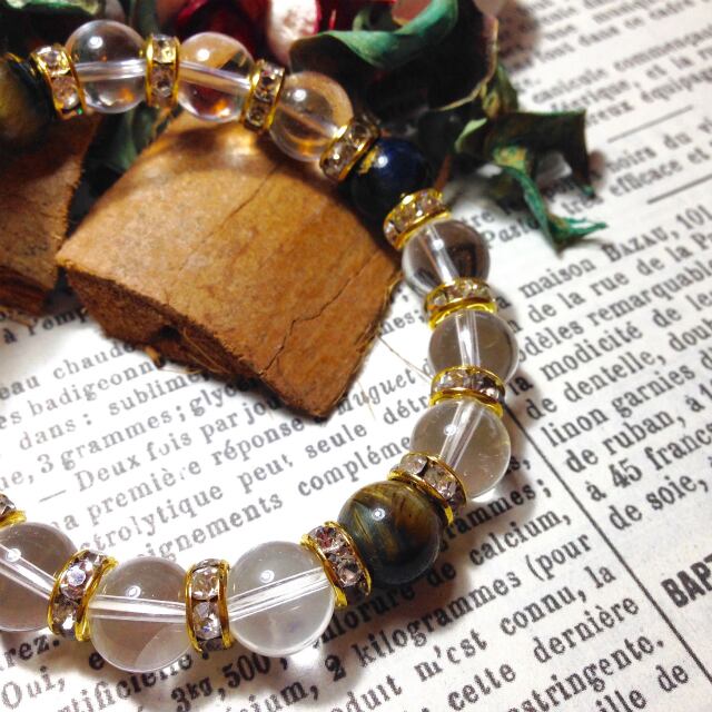 こちらは、10mm玉の水晶と10mm玉のホークスアイを組み合わせた天然石ブレスレットです。間にはゴールドのロンデルを挟み高級感あるデザインに仕上がったブレスレットです。石大きさは腕にも馴染みやすいように10mm玉で内周約18cm(伸可能)です。気になる方は是非この機会にどうぞ。落