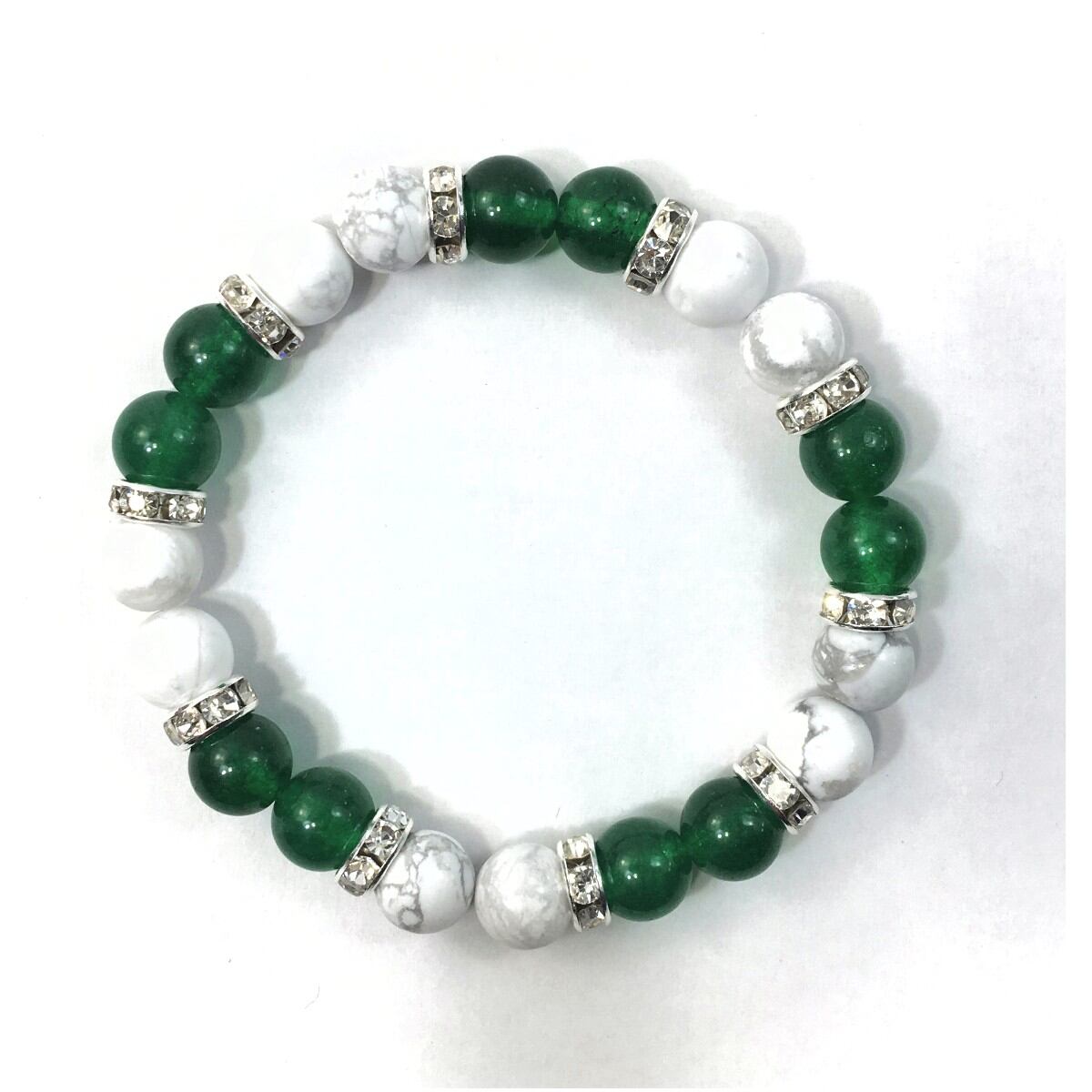 こちらは、ジェイド(グリーン)とハウライトを組み合わせたブレスレットです。間にはロンデルを挟み高級感あるデザインに仕上がっています。石大きさは腕にも馴染みやすいように8mm玉で内周約15cmです。数に限りがございますので気になる方はお早めにどうぞ。