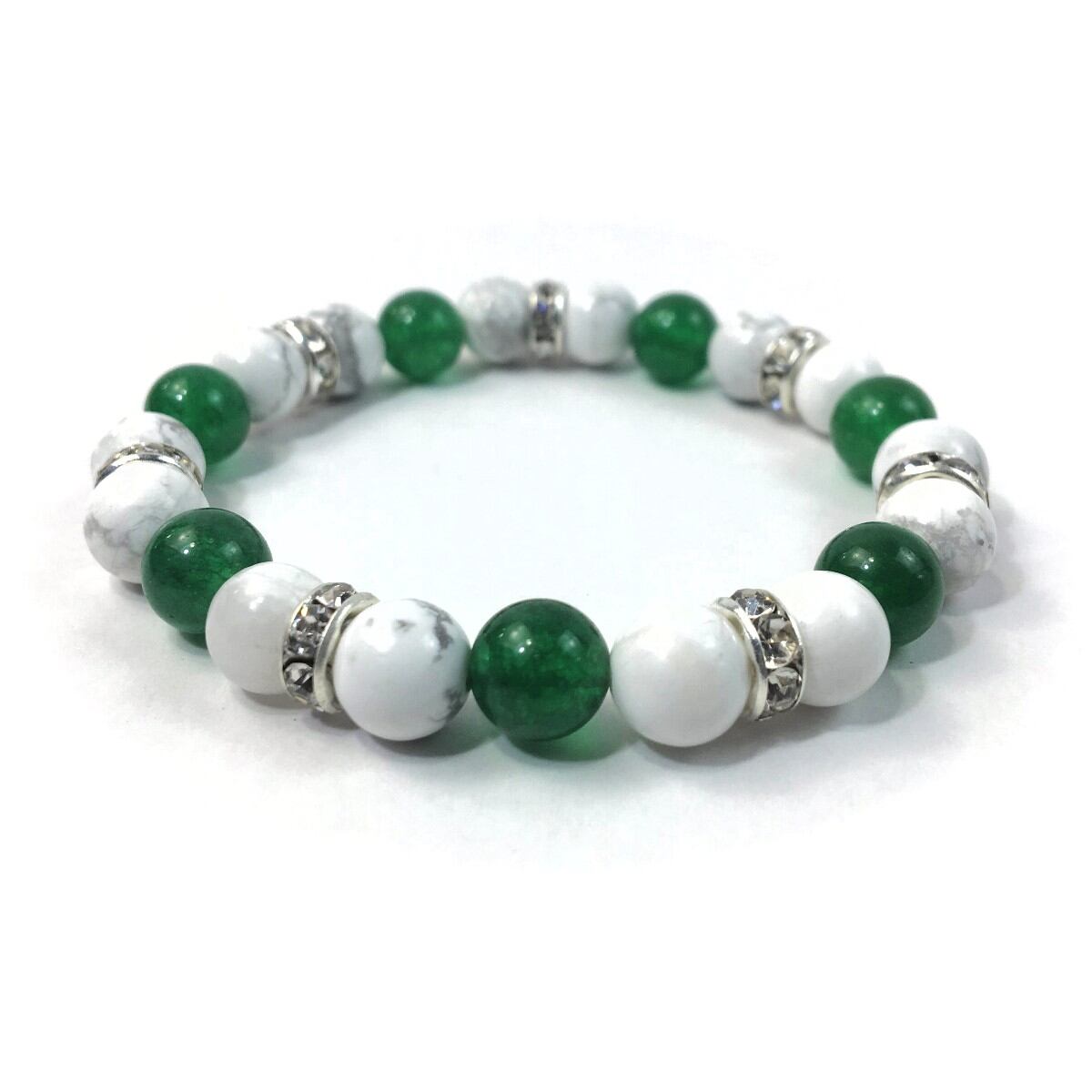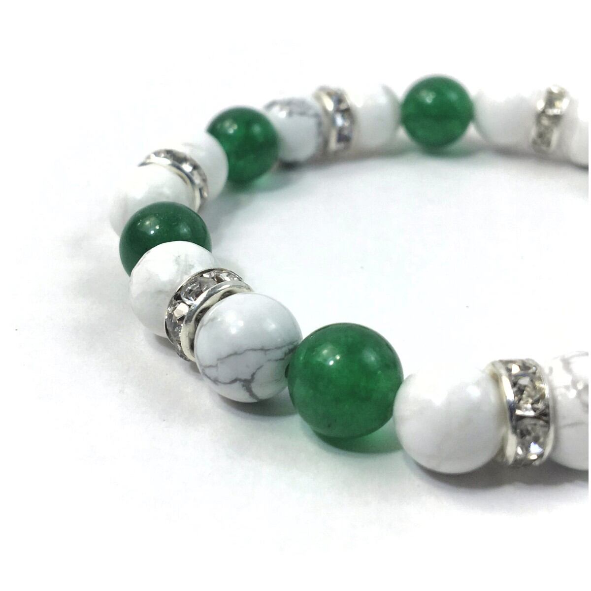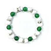 こちらは、ハウライトとジェイド(グリーン)を組み合わせたブレスレットです。間にはロンデルを挟み高級感あるデザインに仕上がっています。石大きさは腕にも馴染みやすいように8mm玉で内周約15cmです。数に限りがございますので気になる方はお早めにどうぞ。