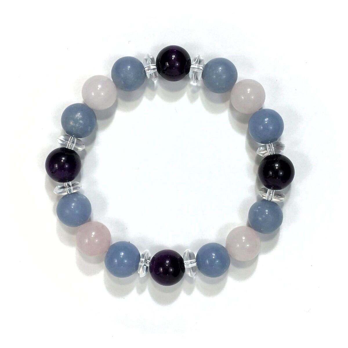 こちらは、パープルタイガーアイとエンジェライトとローズクォーツを組み合わせたパワーストーンブレスレットです。今回は間には水晶ソロバンを挟みアクセントとしております。ロンデルに飽きた方や金属アレルギーがある方にもお勧めできます。石大きさは10mm玉を使用して内周約16cmです。(サイズ変更も無料でお直し致しますので、サイズ変更の場合は取引ナビにてご一報くださいませ) 新しい物を身につけると気分も上がり運気が上がると言われていますので是非この機会にどうぞ。