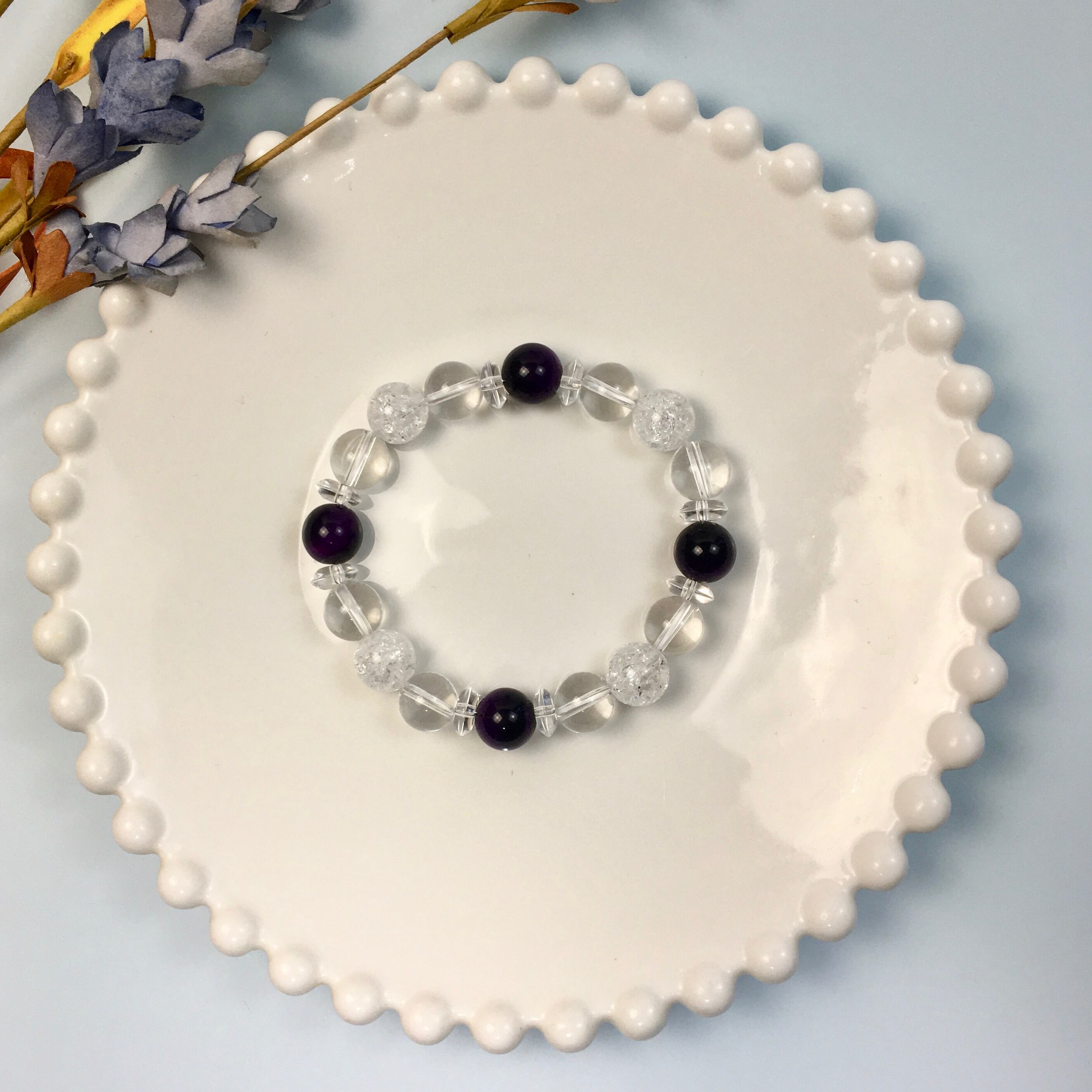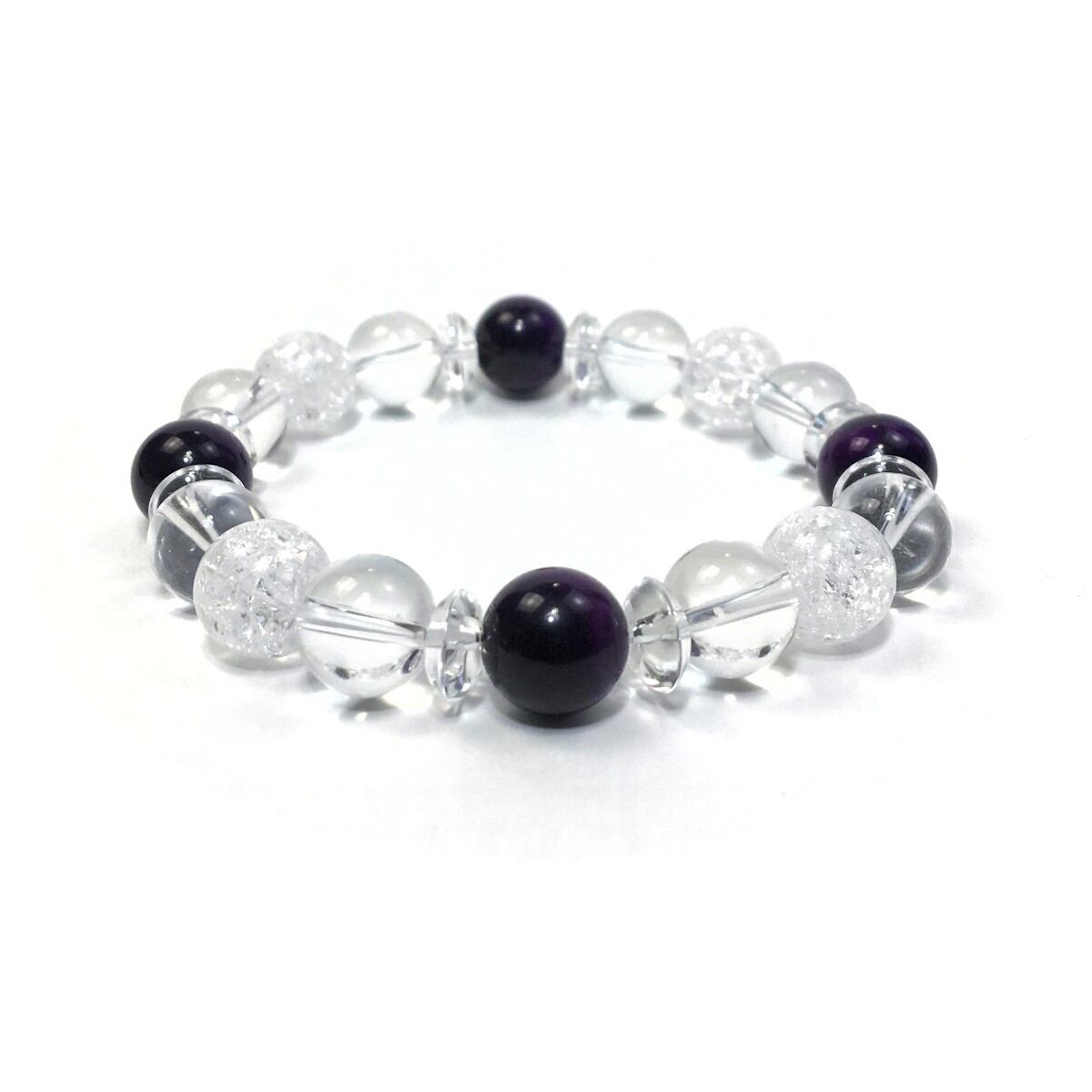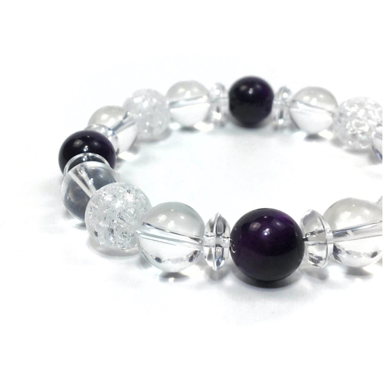 こちらは、パープルタイガーアイと水晶とクラック水晶を組み合わせたパワーストーンブレスレットです。今回は間には水晶ソロバンを挟みアクセントとしております。ロンデルに飽きた方や金属アレルギーがある方にもお勧めできます。石大きさは10mm玉を使用して内周約16cmです。(サイズ変更も無料でお直し致しますので、サイズ変更の場合は取引ナビにてご一報くださいませ) 新しい物を身につけると気分も上がり運気が上がると言われていますので是非この機会にどうぞ。