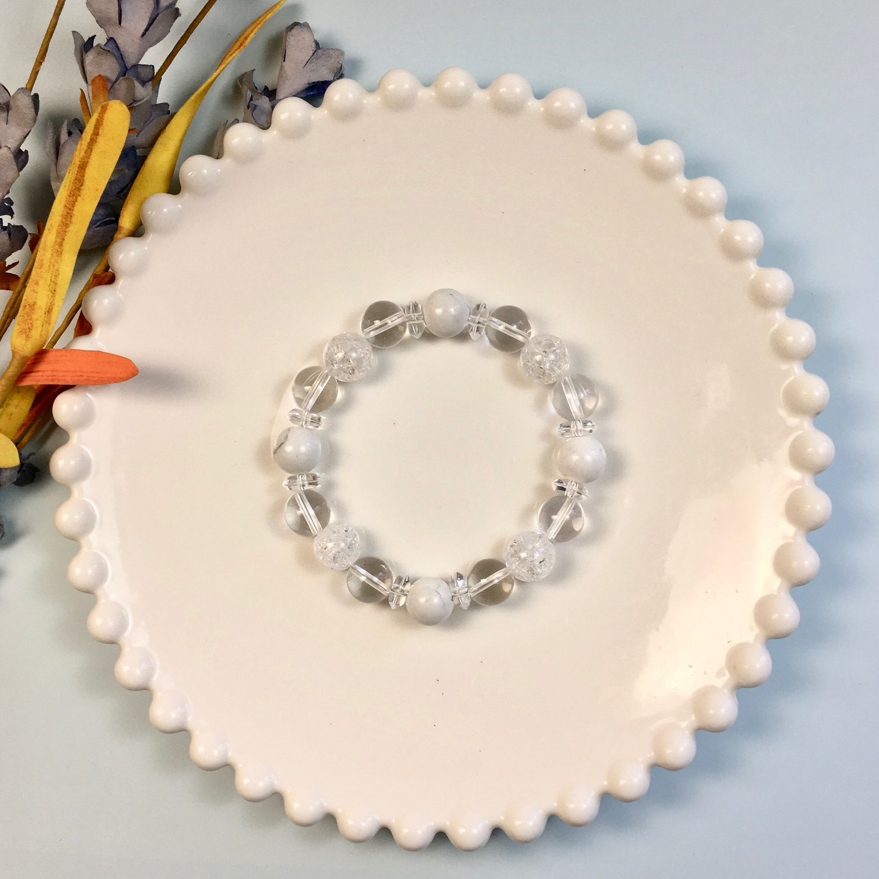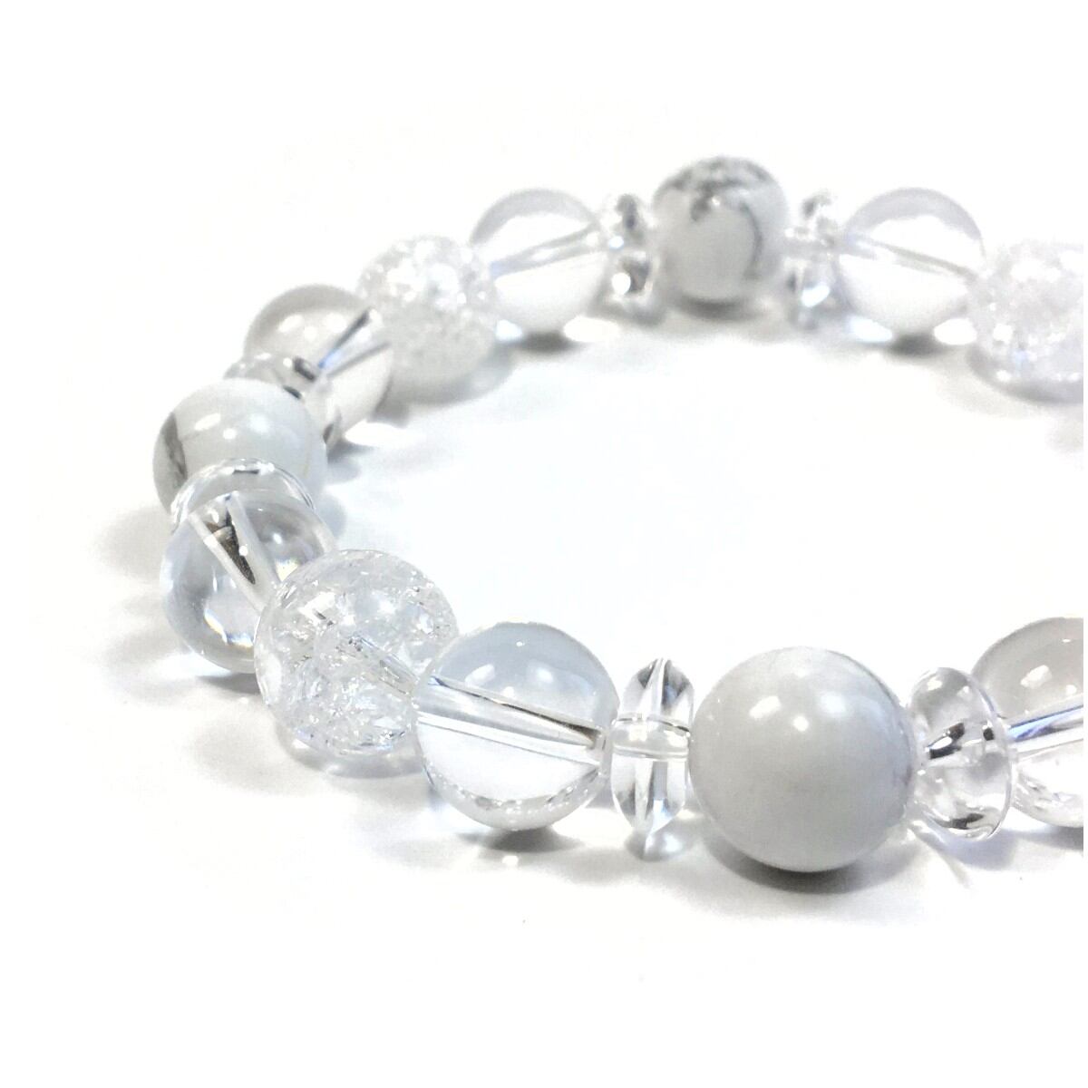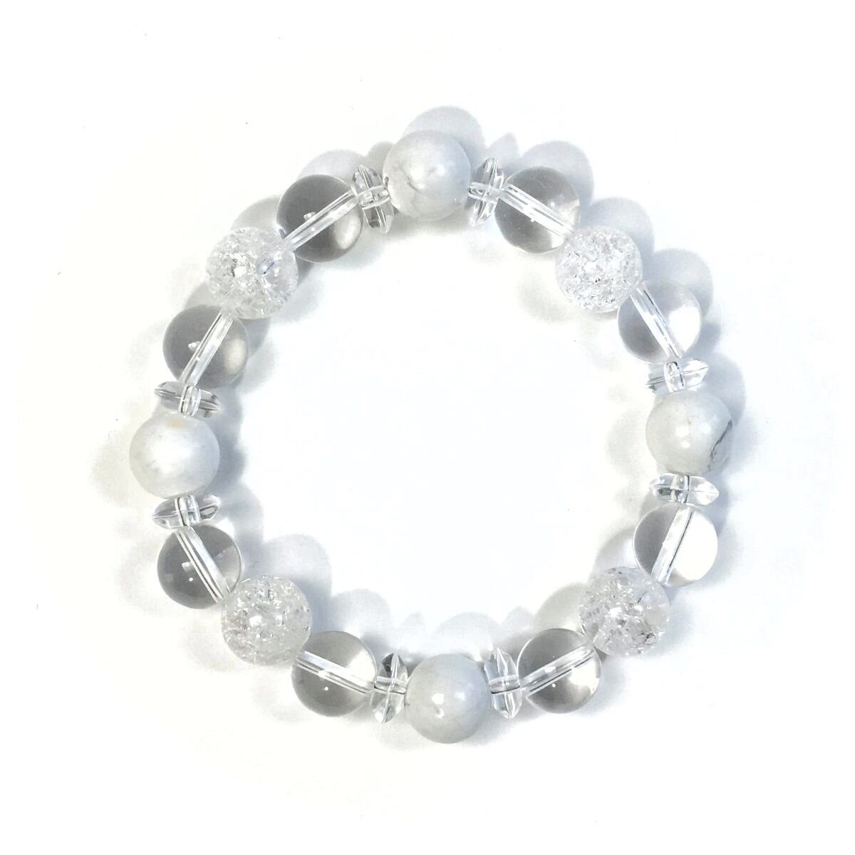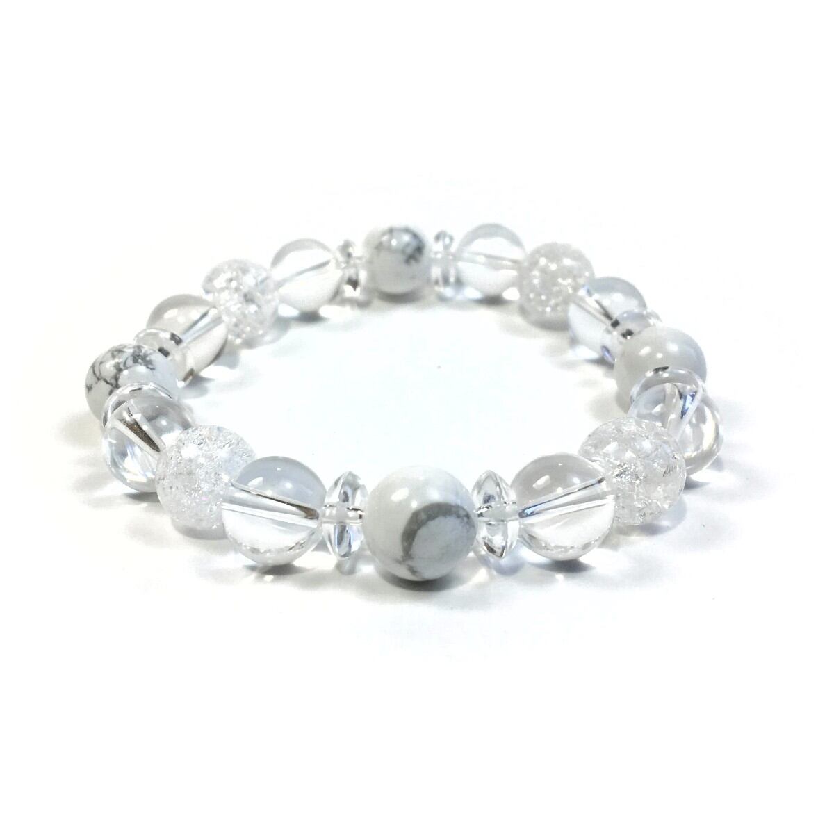こちらは、ハウライトと水晶とクラック水晶を組み合わせたパワーストーンブレスレットです。今回は間には水晶ソロバンを挟みアクセントとしております。ロンデルに飽きた方や金属アレルギーがある方にもお勧めできます。石大きさは10mm玉を使用して内周約16cmです。(サイズ変更も無料でお直し致しますので、サイズ変更の場合は取引ナビにてご一報くださいませ) 新しい物を身につけると気分も上がり運気が上がると言われていますので是非この機会にどうぞ。