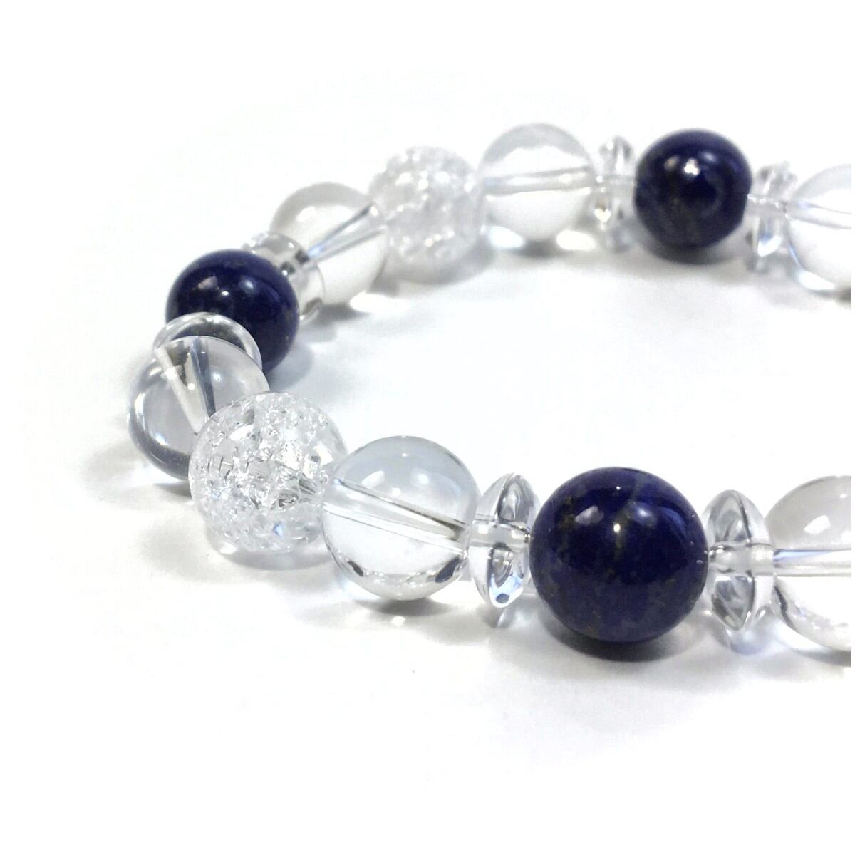 こちらは、ラピスラズリと水晶とクラック水晶を組み合わせたパワーストーンブレスレットです。今回は間には水晶ソロバンを挟みアクセントとしております。ロンデルに飽きた方や金属アレルギーがある方にもお勧めできます。石大きさは10mm玉を使用して内周約16cmです。(サイズ変更も無料でお直し致しますので、サイズ変更の場合は取引ナビにてご一報くださいませ) 新しい物を身につけると気分も上がり運気が上がると言われていますので是非この機会にどうぞ。