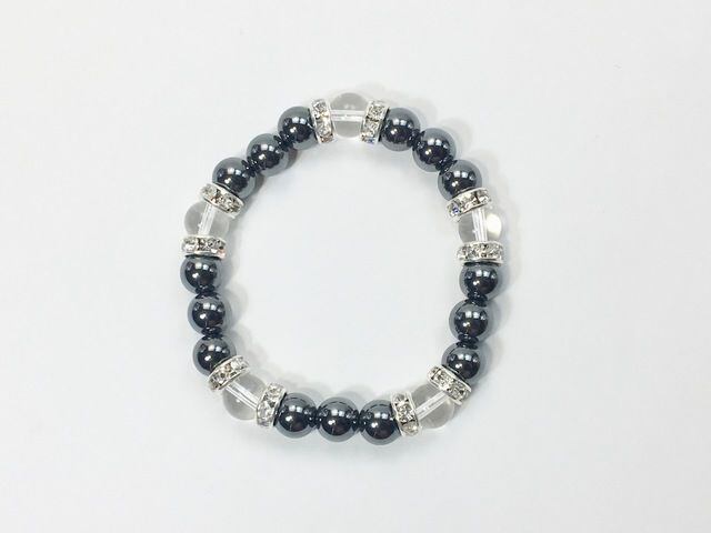 こちらは、8mm玉のヘマタイトと水晶を使ったパワーストーンブレスレットです。シンプルなデザインでどんなコーディネートにも合わせやすいデザインに仕上げています。サイズは内周約15cmです。気になる方は是非この機会にどうぞ。