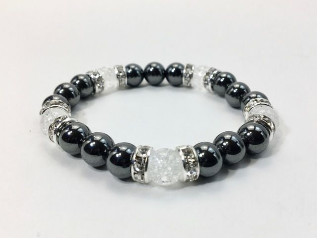 こちらは、8mm玉のヘマタイトとクラック水晶を使ったパワーストーンブレスレットです。シンプルなデザインでどんなコーディネートにも合わせやすいデザインに仕上げています。サイズは内周約15cmです。気になる方は是非この機会にどうぞ。
